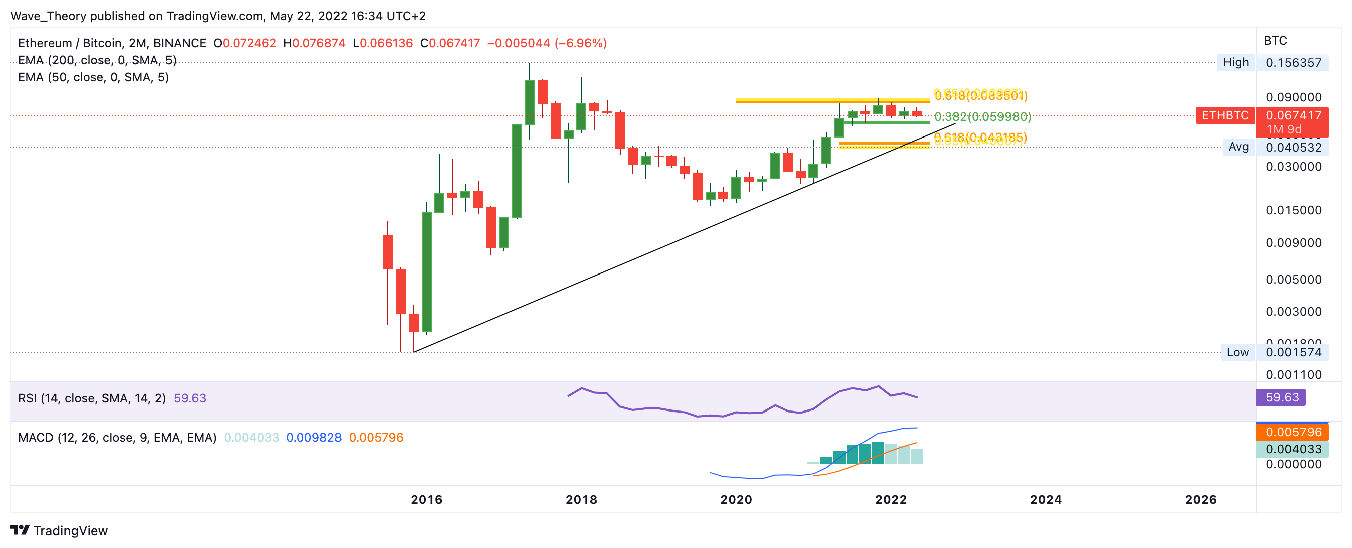 Gegen BTC konnte sich der ETH Preis über dem 0,382 Fib Niveau bei rund 0,06 BTC halten. Bricht Ethereum diese Unterstützung bärisch, so findet ETH bei 0,044 BTC Unterstützung an der Golden Ratio, wodurch zusätzlich die Trendlinie verläuft, welche die Tiefpunkte aus 2016 und 2021 miteinander verbindet.