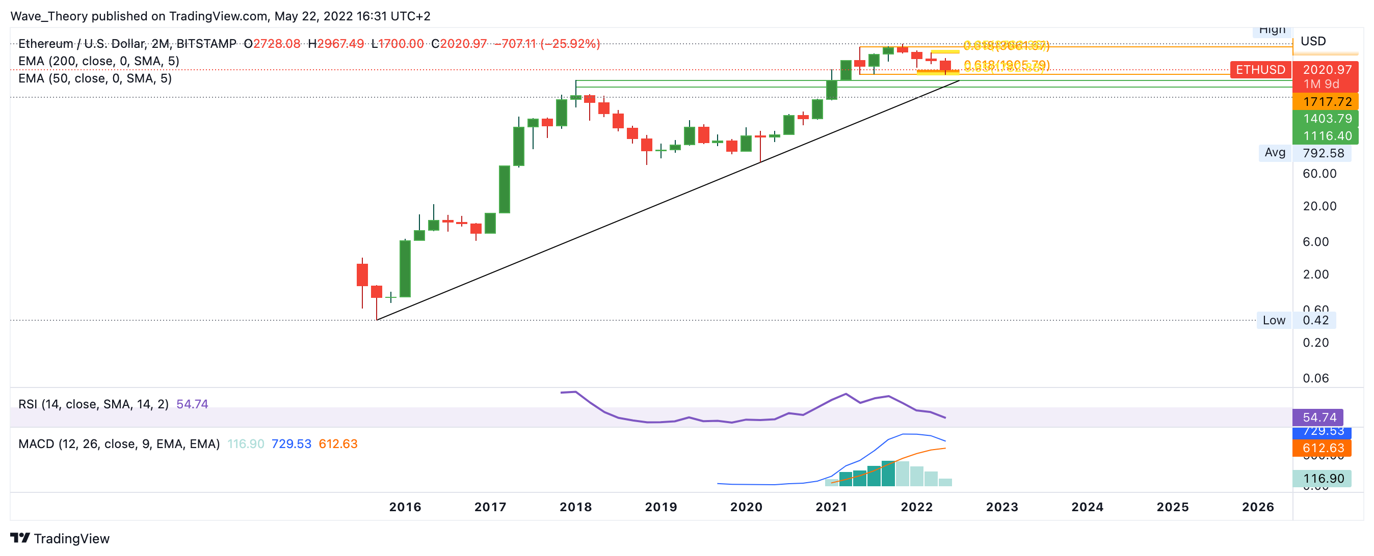Bricht der Ethereum Kurs hingegen die Golden Ratio Unterstützung bei rund 1.700 USD bärisch, dann könnte Ethereum zum Hochpunkt aus 2017 zurückkehren. Zwischen rund 1.100 – 1.400 USD stößt der Ethereum Kurs dann auf sehr starke Unterstützung. Zusätzlich verläuft durch dieses Preisniveau die Trendlinie, welche die Tiefpunkte aus dem Jahr 2016 und 2020 verbindet.