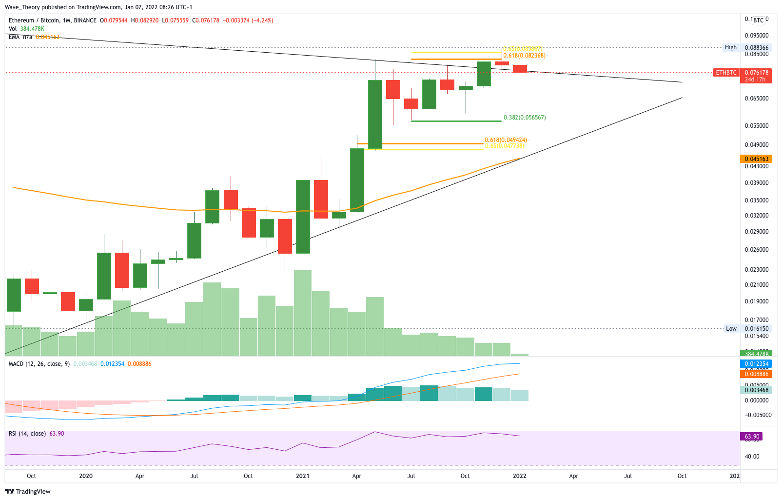 Gegen BTC wird Ethereum aktuell an der Golden Ratio bei rund 0,085 BTC abgewiesen. Ethereum könnte bis zur 0,382 Fib Unterstützung bei 0,056 BTC oder gar zur Golden Ratio bei 0,05 BTC zurückkehren.