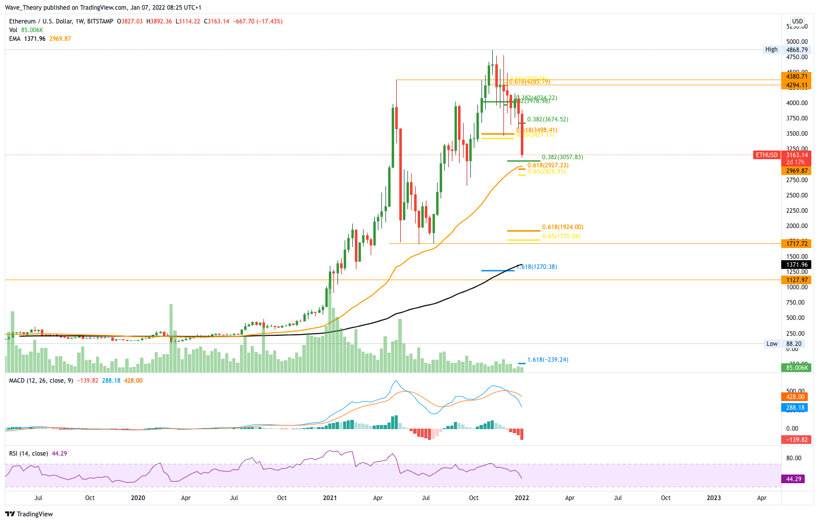 Der Ethereum Kurs könnte sehr stark am 50-Wochen-EMA abprallen, welcher durch die beiden Fibonacci Unterstützungen bei rund 3.000 USD verläuft. Jedoch zeigt sich auch im wöchentlichen MACD noch kein bullisches Zeichen. Stattdessen sind die MACD Linien bärisch überkreuzt und auch das Histogramm tickt bärisch nach unten.