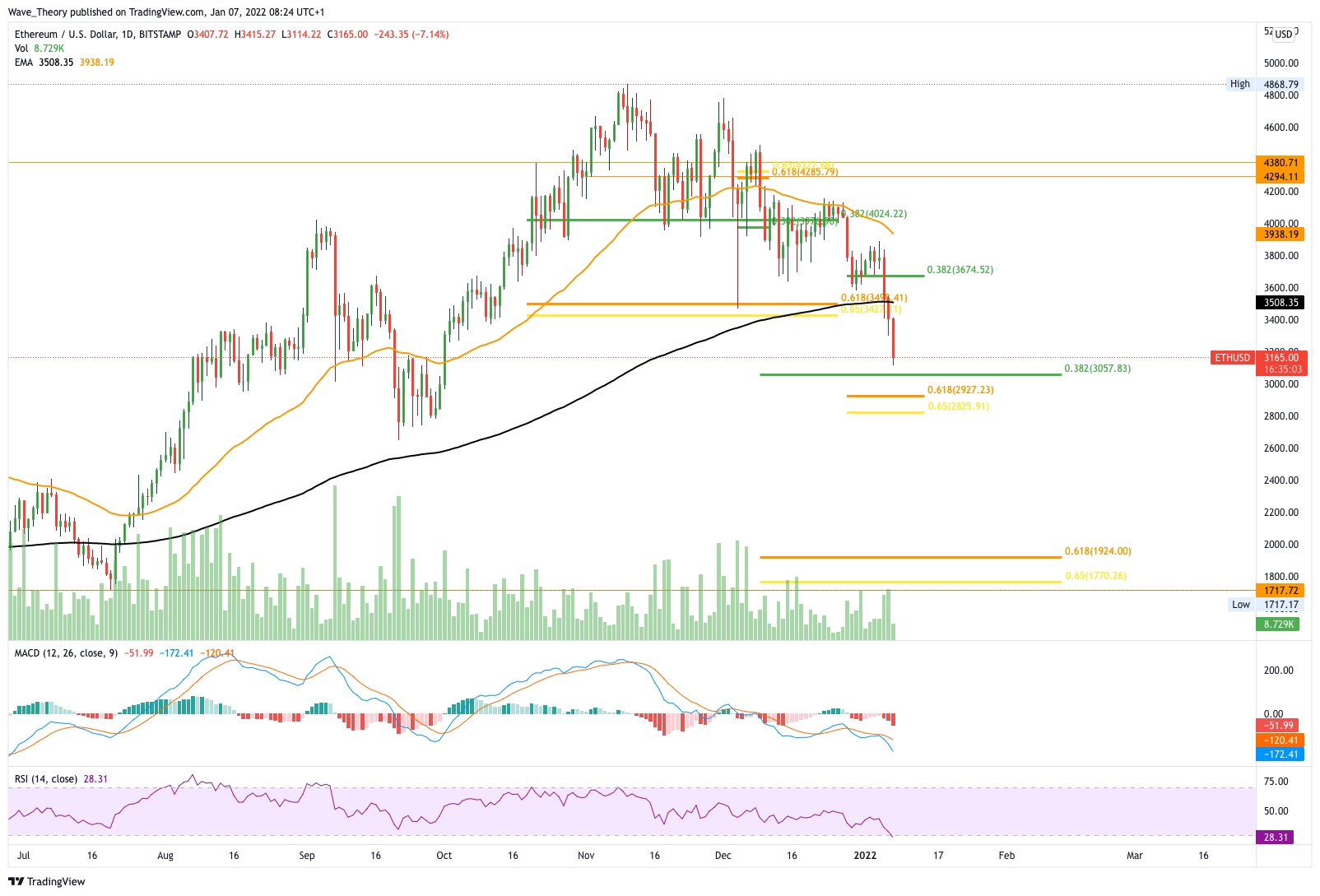 Der Ethereum Kurs scheiterte am 50-Tage-EMA bei rund 4.000 USD, nachdem er an der Golden Ratio bei rund 3.500 USD abgeprallt war. Daraufhin durchbrach der Ethereum Kurs die Golden Ratio Unterstützung und auch den 200-Tage-EMA bei 3.500 USD. Damit befindet sich Ethereum auf dem Weg zur Fibonacci Unterstützung bei rund 3.000 USD. Dort liegt eine weitere wichtige Golden Ratio Unterstützung und eine 0,382 Fib Unterstützung. Der MACD zeigt sich im Tageskurs bärisch, während der RSI allmählich überverkaufte Regionen erreicht.