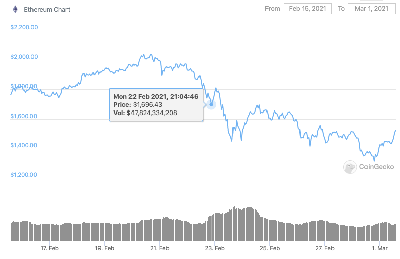 Anschließend ist der ETH Preis weiter gefallen und im wesentlichen dem Bitcoin Kurs gefolgt. In der letzten Woche gab es eine starke Korrelation zwischen den beiden größten Krypto-Assets. Am 28. Februar 2021 ist der Ethereum auf 1300 US-Dollar gefallen. Der Bitcoin Kurs ist sogar auf 43.000 US-Dollar gesunken und damit innerhalb von einer Woche um ca. 25% gefallen.