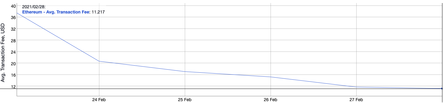 Am 28. Februar 2021 sind die Ethereum Transaktionsgebühren (die „Gas Fees“) auf knapp 10 US-Dollar gefallen. Am 23. Februar 2021 lag der Durchschnittspreis für eine Transaktion noch bei 38.21 US-Dollar.