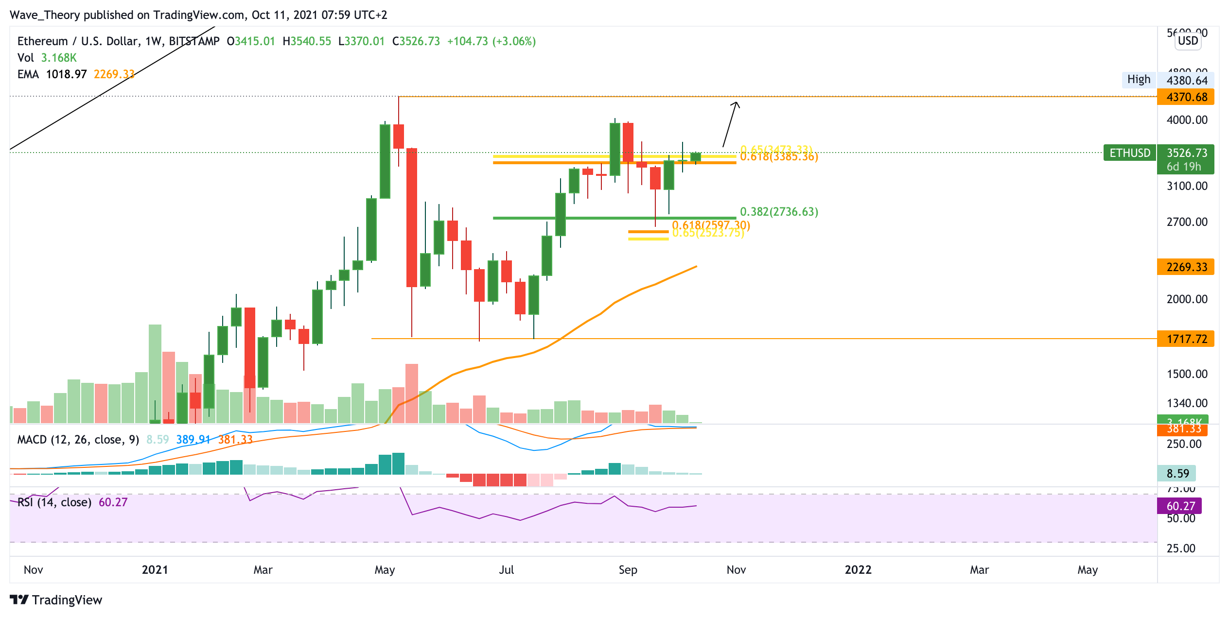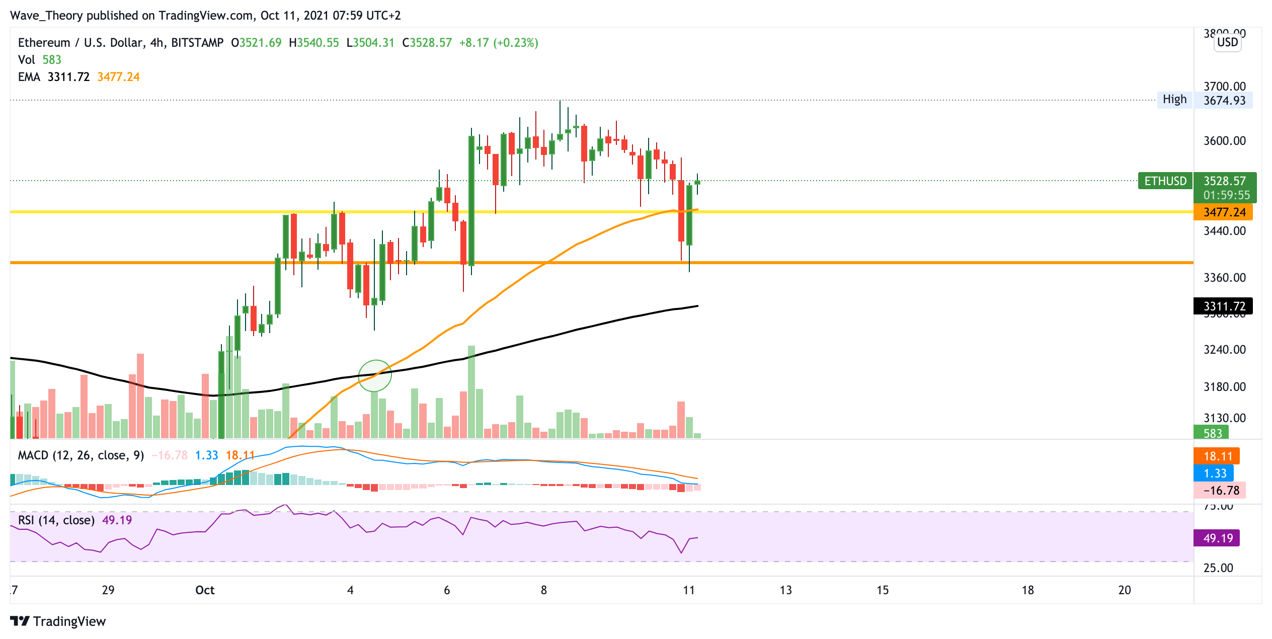 Der Ethereum Kurs korrigierte gestern auf die wichtige Unterstützung bei 3.300 USD, woran er heute abprallt. Sollte die Unterstützung erfolgreich halten, so befindet sich Ethereum auf dem Weg zum Allzeithoch bei rund 4.400 USD. Ansonsten findet der ETH Kurs bei 3.255 USD und bei rund 2.700 USD Unterstützung, wo die 200-Tage-und 50-Tage-EMAs die wichtigen Fibonacci Niveaus kreuzen. Hingegen dieser bullischen Entwicklung, zeigt sich das Histogramm des MACDs eher bärisch.