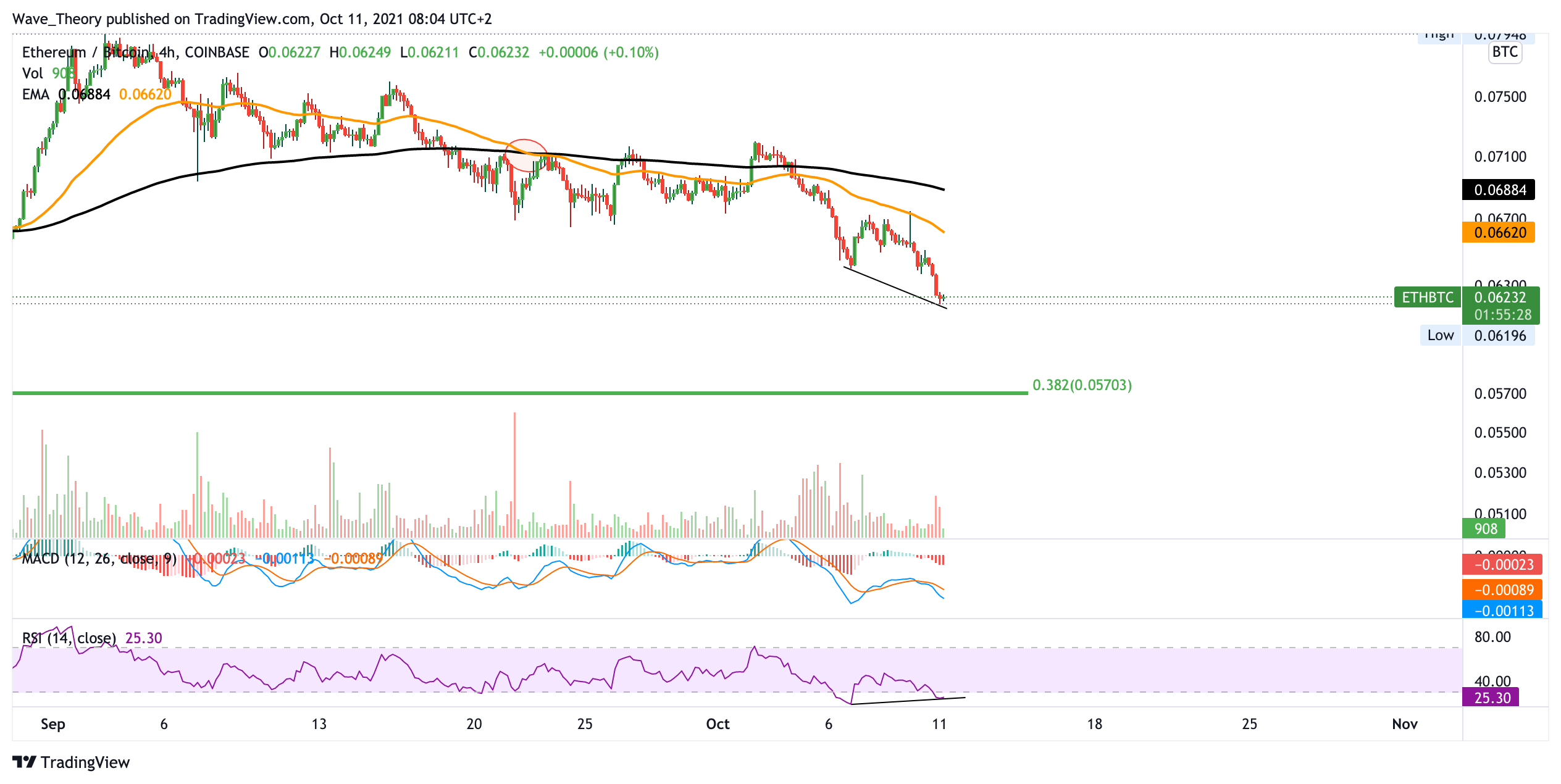 Im Gegensatz dazu zeigen sich leichte bullische Tendenzen im 4H Kurs, denn dort könnte sich eine bullische Divergenz im RSI bilden. Dann könnte der ETH Kurs stark nach oben abprallen. Jedoch könnte sich die bullische Divergenz auch noch bis zum Fib Niveau bei 0,057 BTC ziehen. Darüber hinaus liegt ein Death Cross der EMAs vor, was den kurzfristigen Trend bärisch bestätigt. Daher scheint BTC aktuell bullischer als ETH.