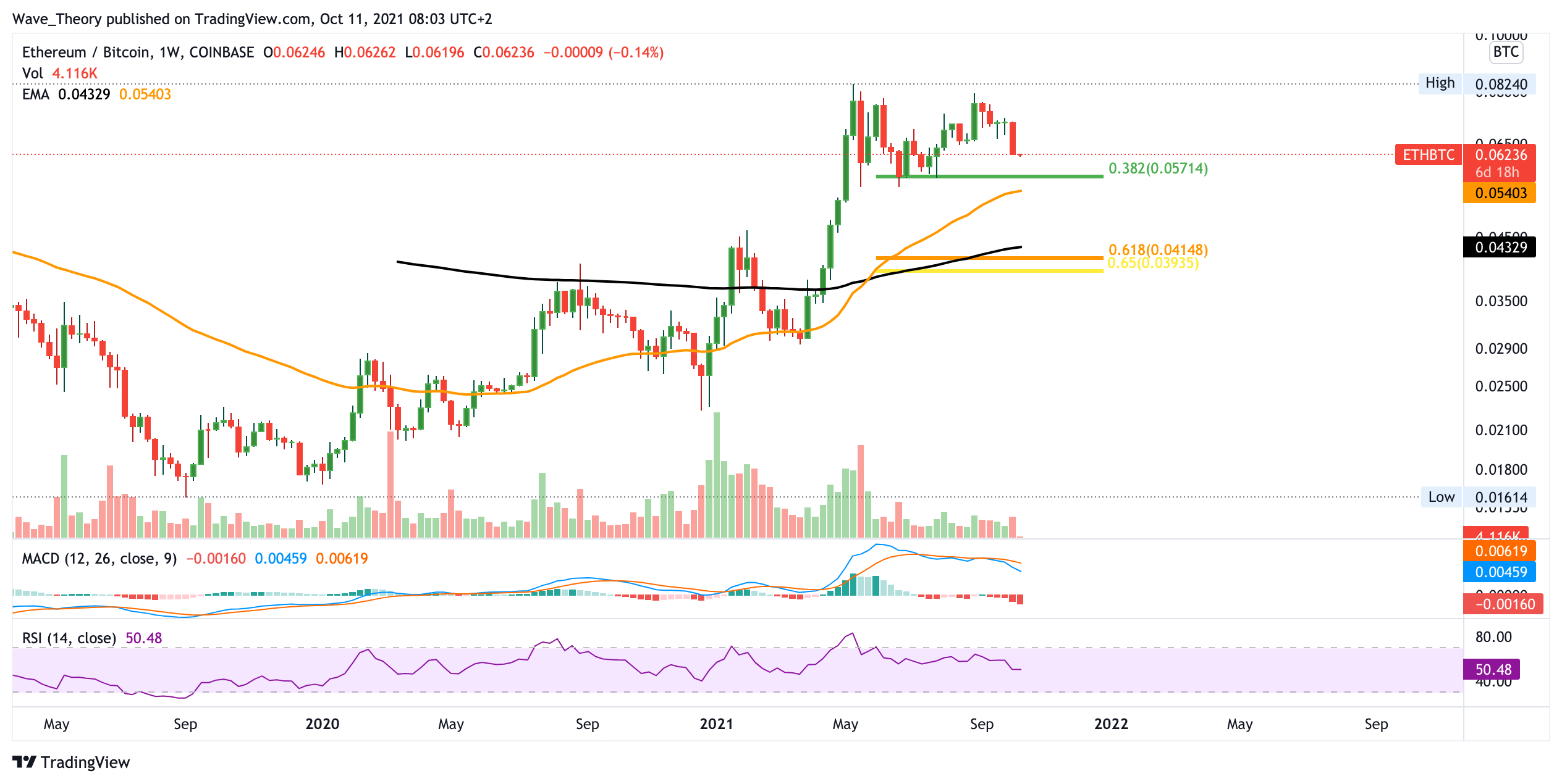 Gegen Bitcoin zeigt sich der Ethereum Kurs eher bärisch, zumindest kurzfristig. Mittelfristig ist der ETH/BTC Kurs nämlich sehr bullisch, wie durch das Golden Crossover und dem intakten Aufwärtstrend bestätigt wird. Jedoch könnte der ETH/BTC Preis auf das Fibonacci Niveau bei 0,057 BTC zurückfallen. Sollte dieses Preisniveau gebrochen werden, so findet der ETH/BTC Preis erst wieder bei 0,041 BTC Unterstützung.
