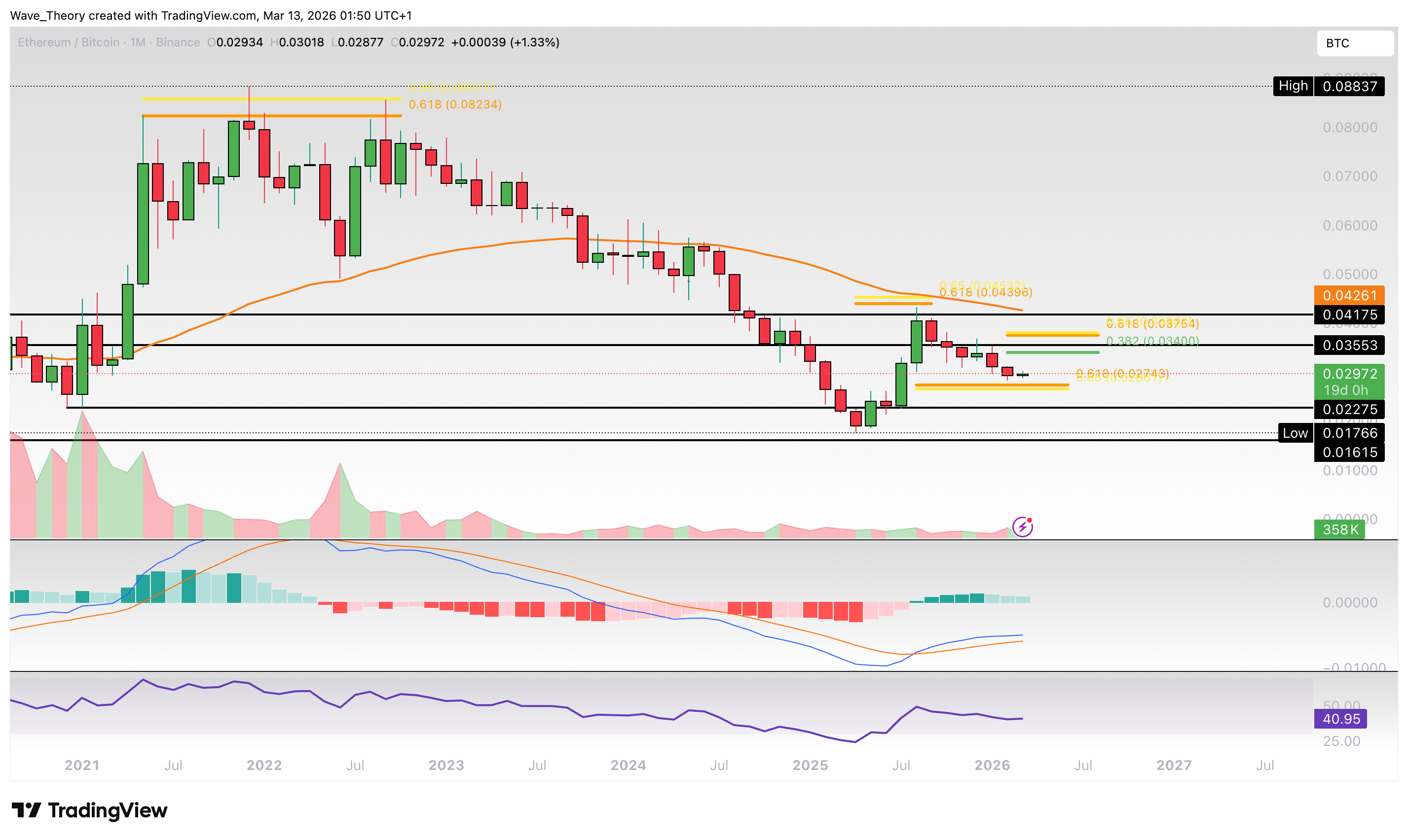 Ein zusätzlicher bedeutender Widerstand liegt am Golden-Ratio-Niveau bei rund 0,038 BTC. Sollte Ethereum diese Hürden überwinden, rückt der 50-Monate-EMA bei etwa 0,0426 BTC als nächster signifikanter Widerstand in den Fokus.