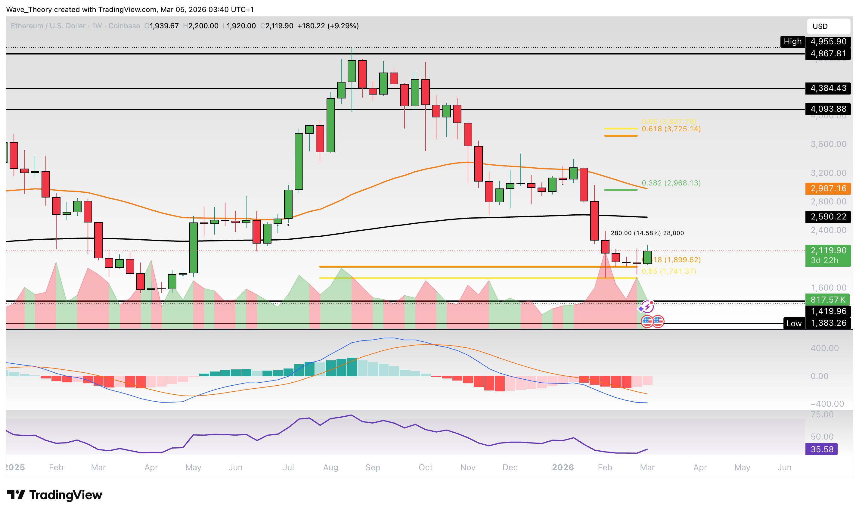 Im Wochenchart liegt bei 2.590 USD (200-Wochen-EMA) ein weiterer wichtiger Widerstand. Im Tageschart zeigen die EMAs noch ein Death Cross (bärisch), während der MACD bullische Signale liefert. Kurzfristige Widerstände liegen bei 2.289 USD (50-Tage-EMA) und 2.929 USD (200-Tage-EMA).