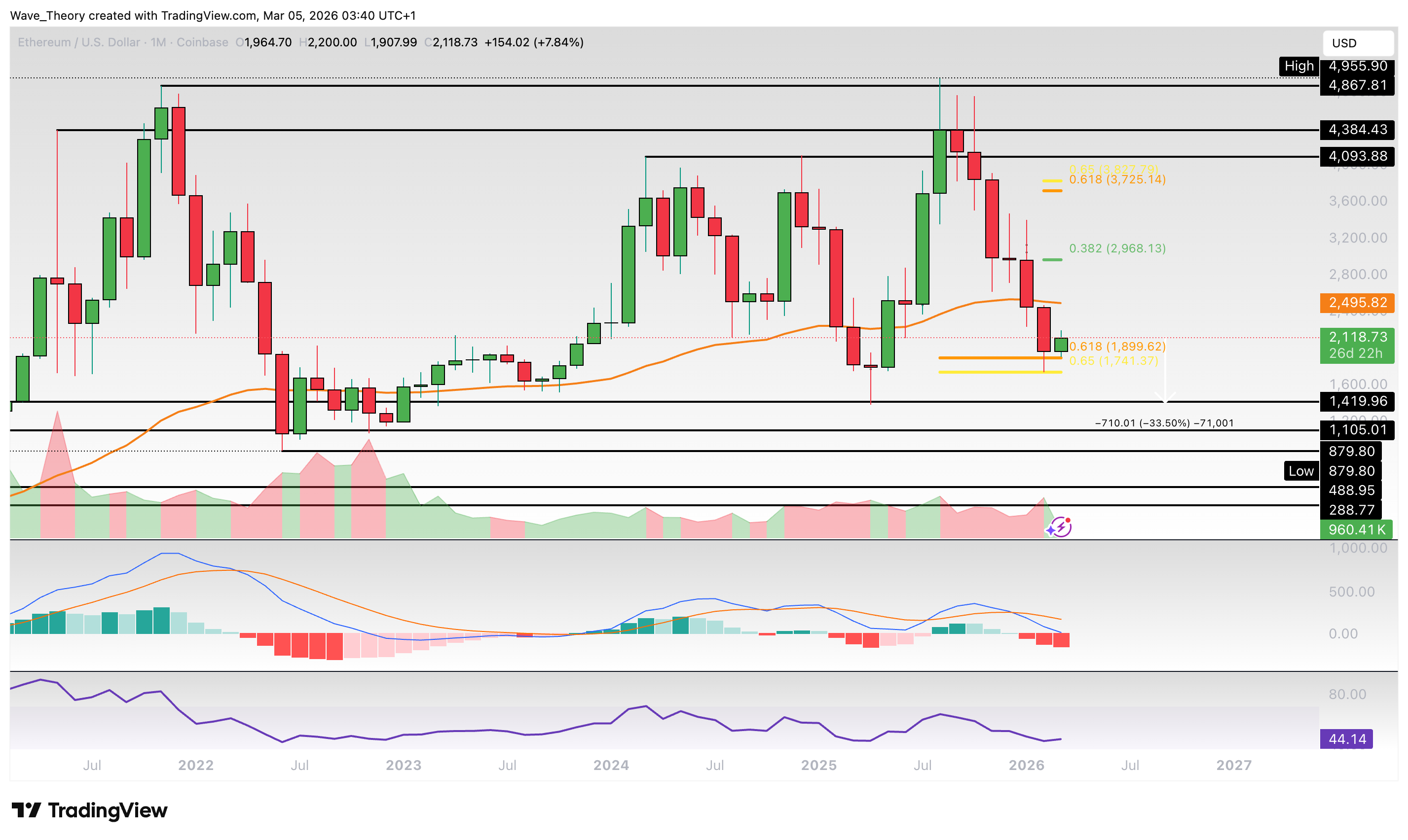Dann könnte Ethereum das ATH bei rund 4.955 USD anvisieren oder gar übersteigen. Davon abgesehen haben sich die MACD Linien im Monatschart bärisch überkreuzt und das Histogramm des MACDs tickt seit einigen Monaten bärisch tiefer.