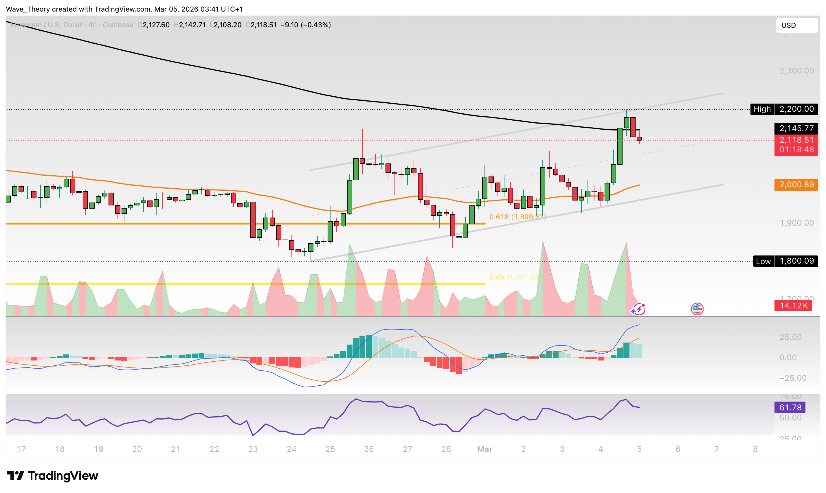 Im 4H-Chart bewegt sich ETH in einem parallelen Aufwärtskanal mit Unterstützung um 2.000 USD und Widerstand bei 2.145 USD.