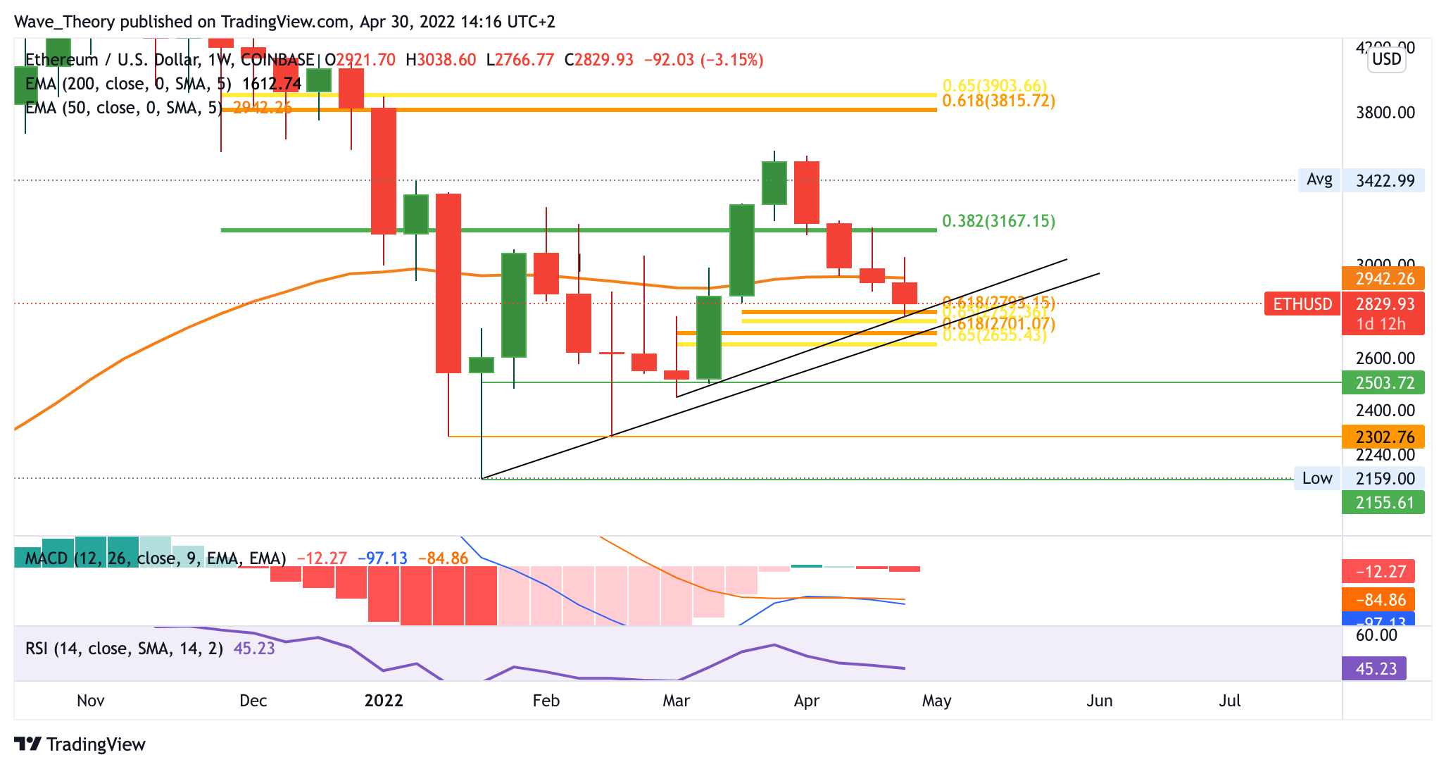 Auch diese Woche scheint der Ethereum Kurs bärisch zu schließen. Damit ist dies die vierte bärische Woche in Folge. Keine Woche im April konnte bullisch verlaufen für den Ethereum Kurs und das spiegelt sich auch im MACD wider. Schließlich zeigt sich auch der wöchentliche MACD bärisch, denn die MACD Linien bleiben überkreuzt und das Histogramm tickt bärisch tiefer. Sollte Ethereum sich über der Golden Ratio Unterstützung zwischen 2.700 – 2.800 USD halten können, könnte er den 50-Wochen-EMA bei rund 2.950 USD anvisieren oder gar das 0,382 Fib Niveau bei rund 3.200 USD. Bricht er jedoch durch die Golden Ratio Unterstützung bärisch aus, wartet erst wieder bei 2.500 USD die nächste Unterstützung auf den ETH Kurs. Sollte auch diese Unterstützung brechen, findet Ethereum erst wieder zwischen 2.150 – 2.300 USD Unterstützung.