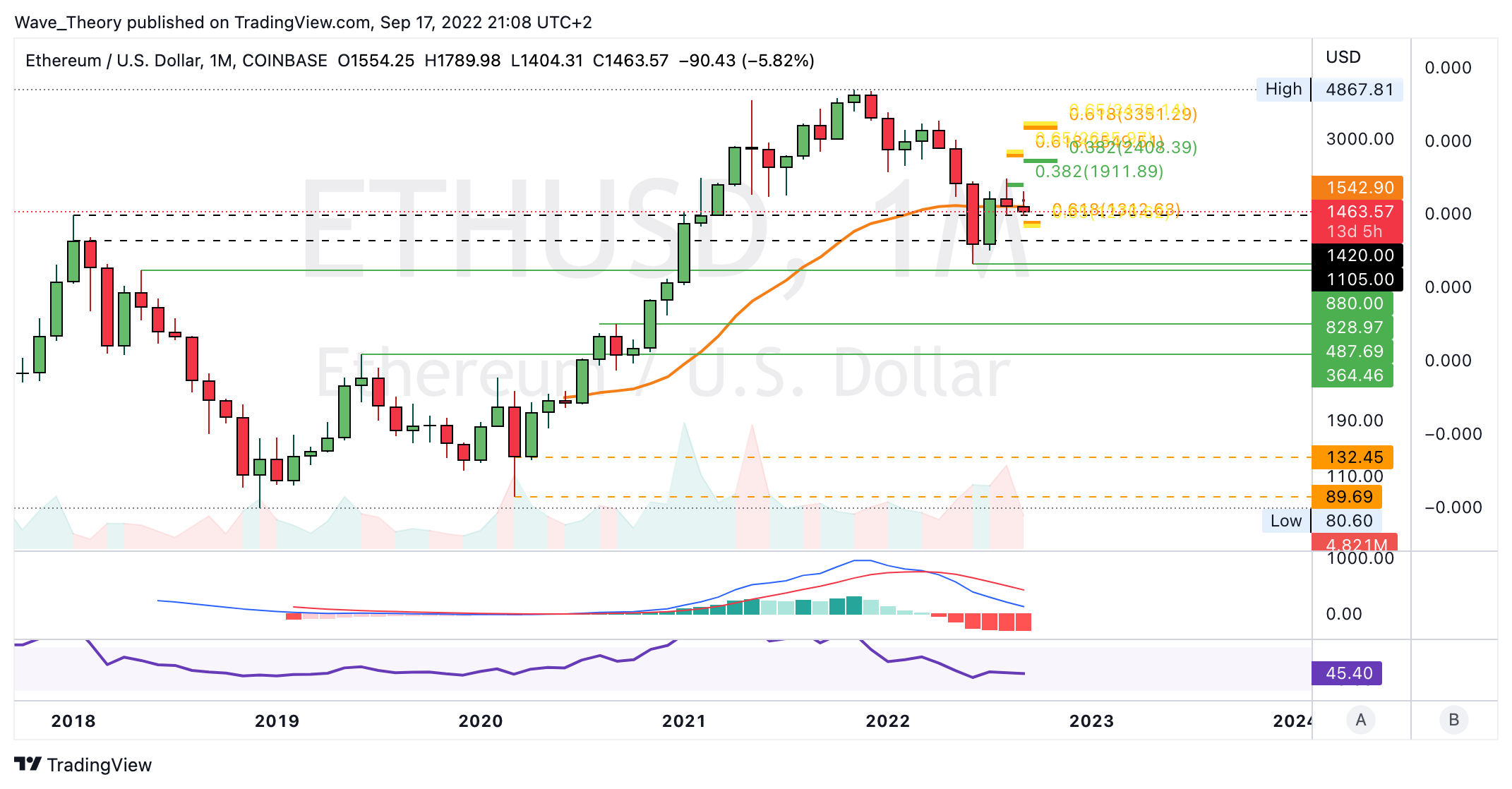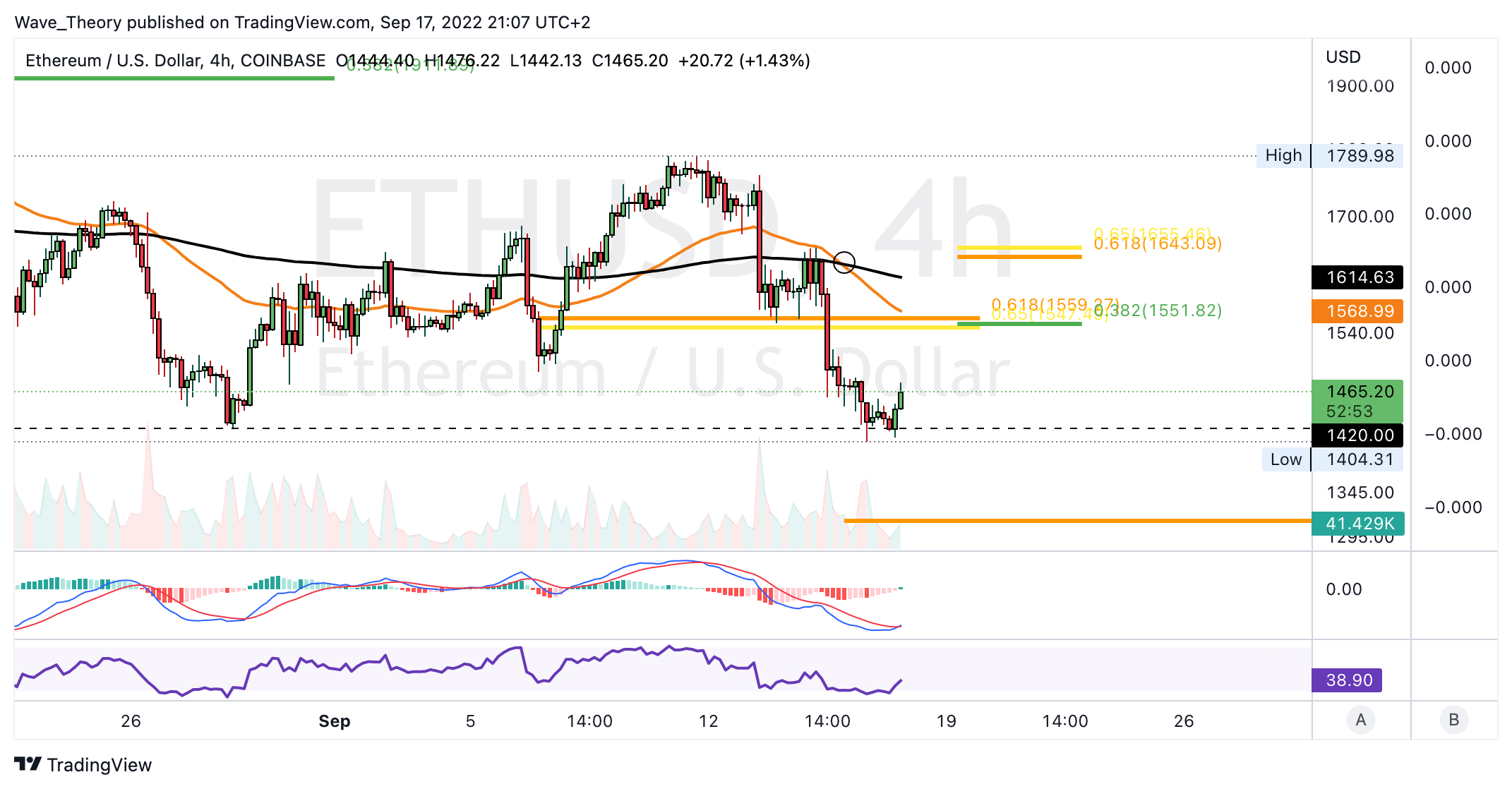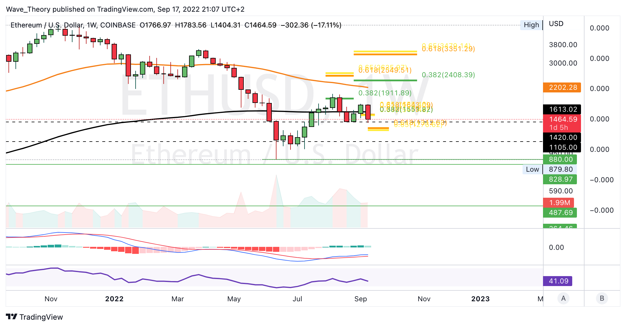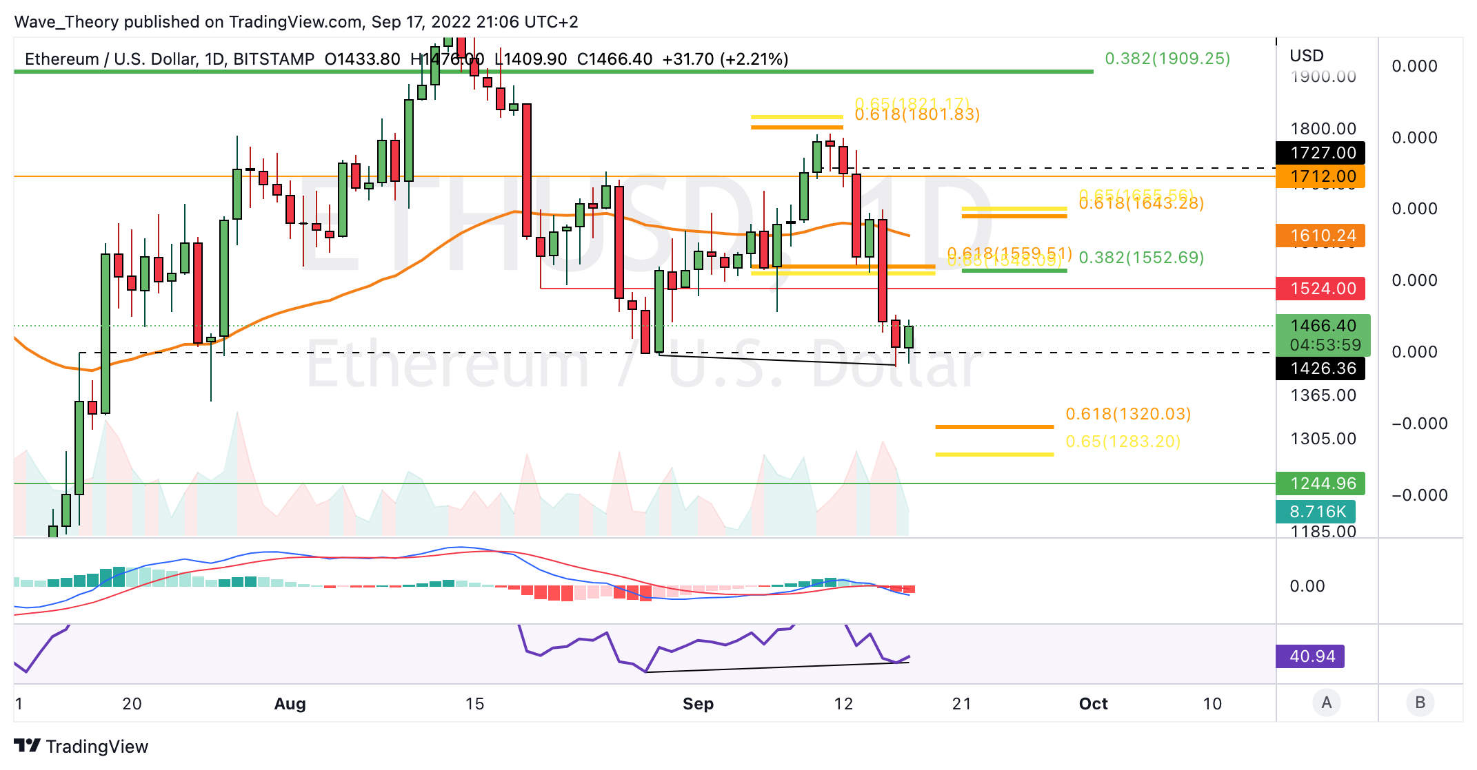 Die MACD Linien sind dabei aber noch bullisch überkreuzt und der RSI zeigt sich neutral. Mittelfristig findet Ethereum immer noch starke horizontale Unterstützung zwischen 1.105 USD und 1.420 USD. Zudem könnte Ethereum sehr stark an der Golden Ratio Unterstützung bei rund 1.300 USD abprallen.