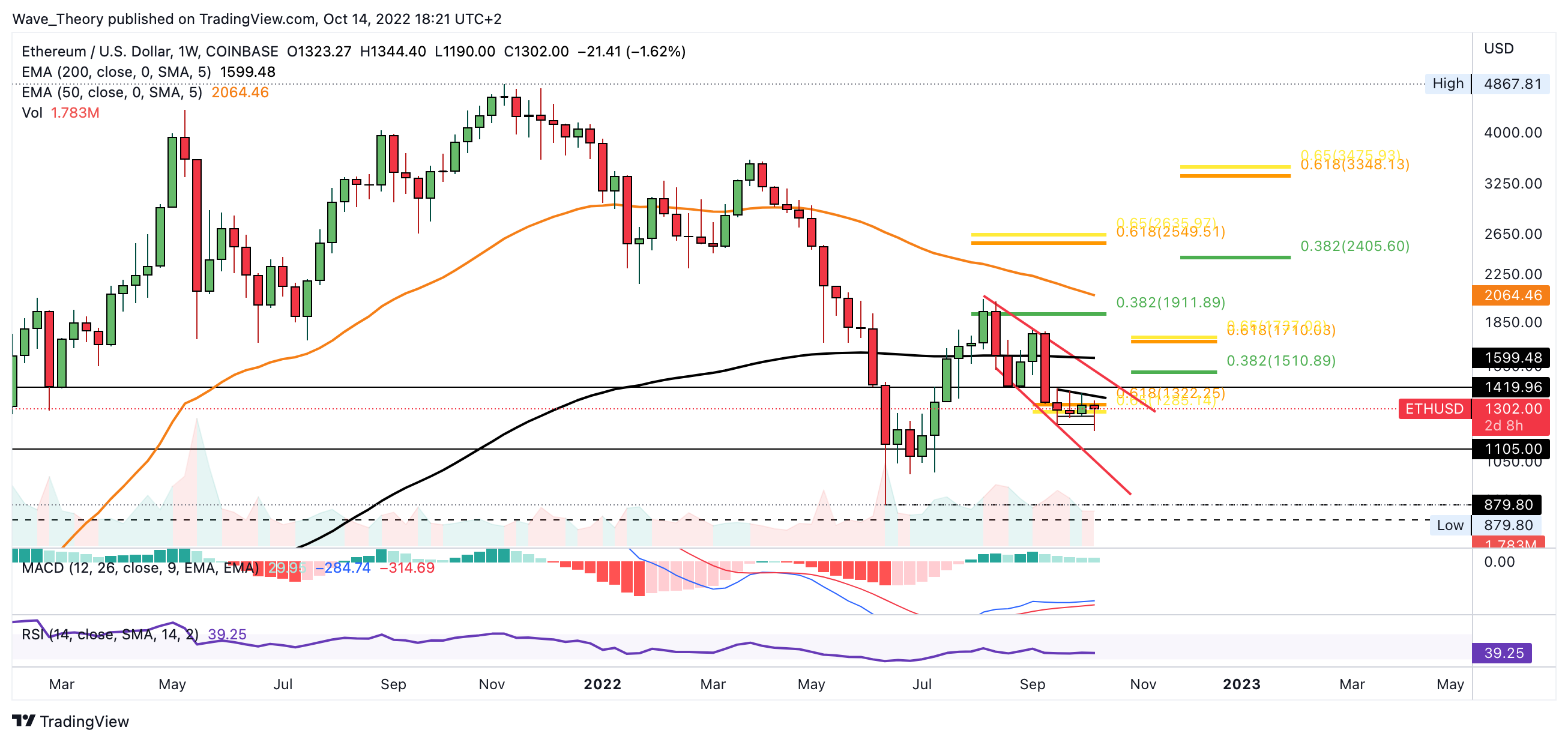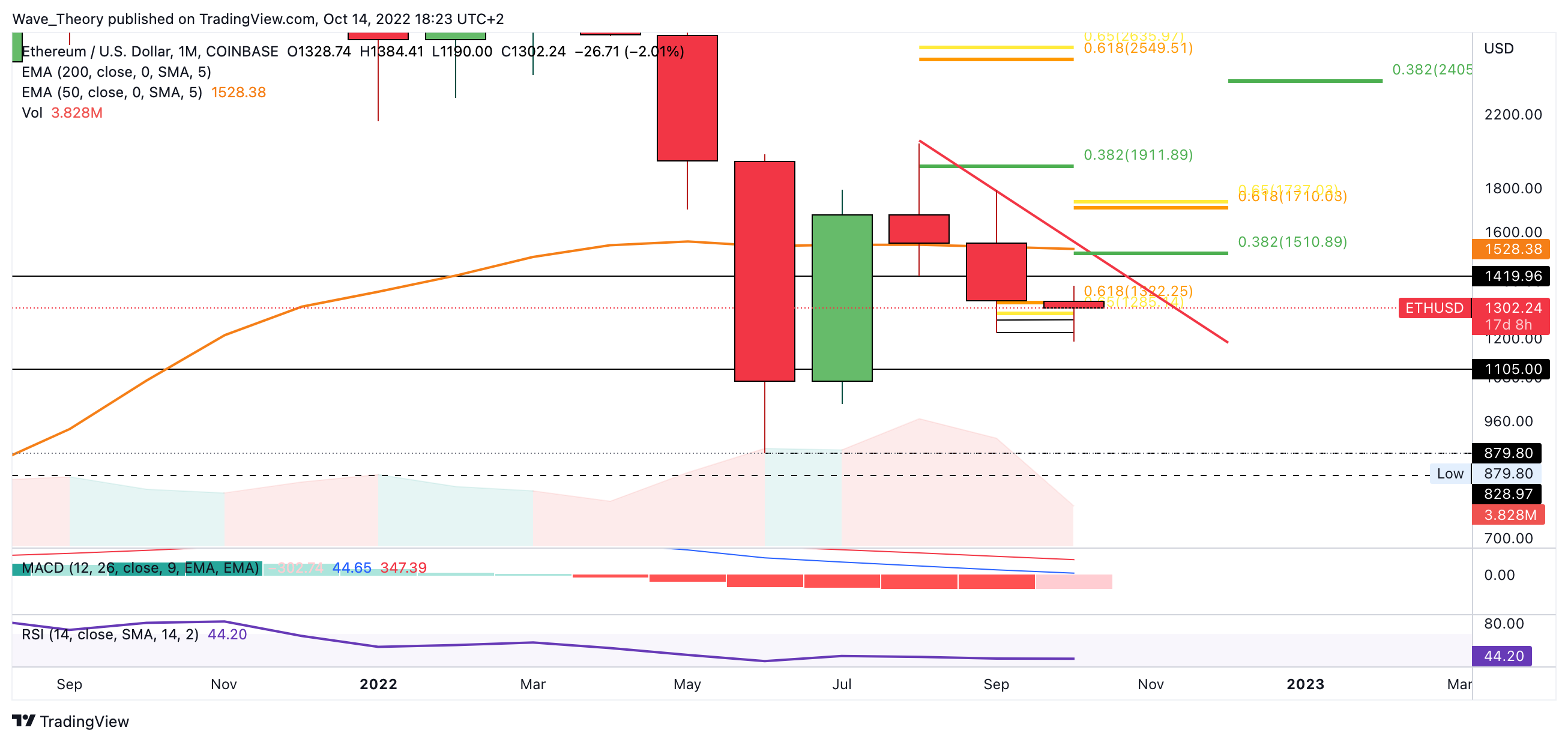 Bei rund 1.510 USD stößt Ethereum auf den nächsten signifikanten Fib Widerstand. Zudem verläuft dort der 50-Monate-EMA, welcher ebenfalls als Widerstand fungiert. Um die Korrekturbewegung zu beenden, muss Ethereum die Golden Ratio bei rund 1.720 USD brechen.