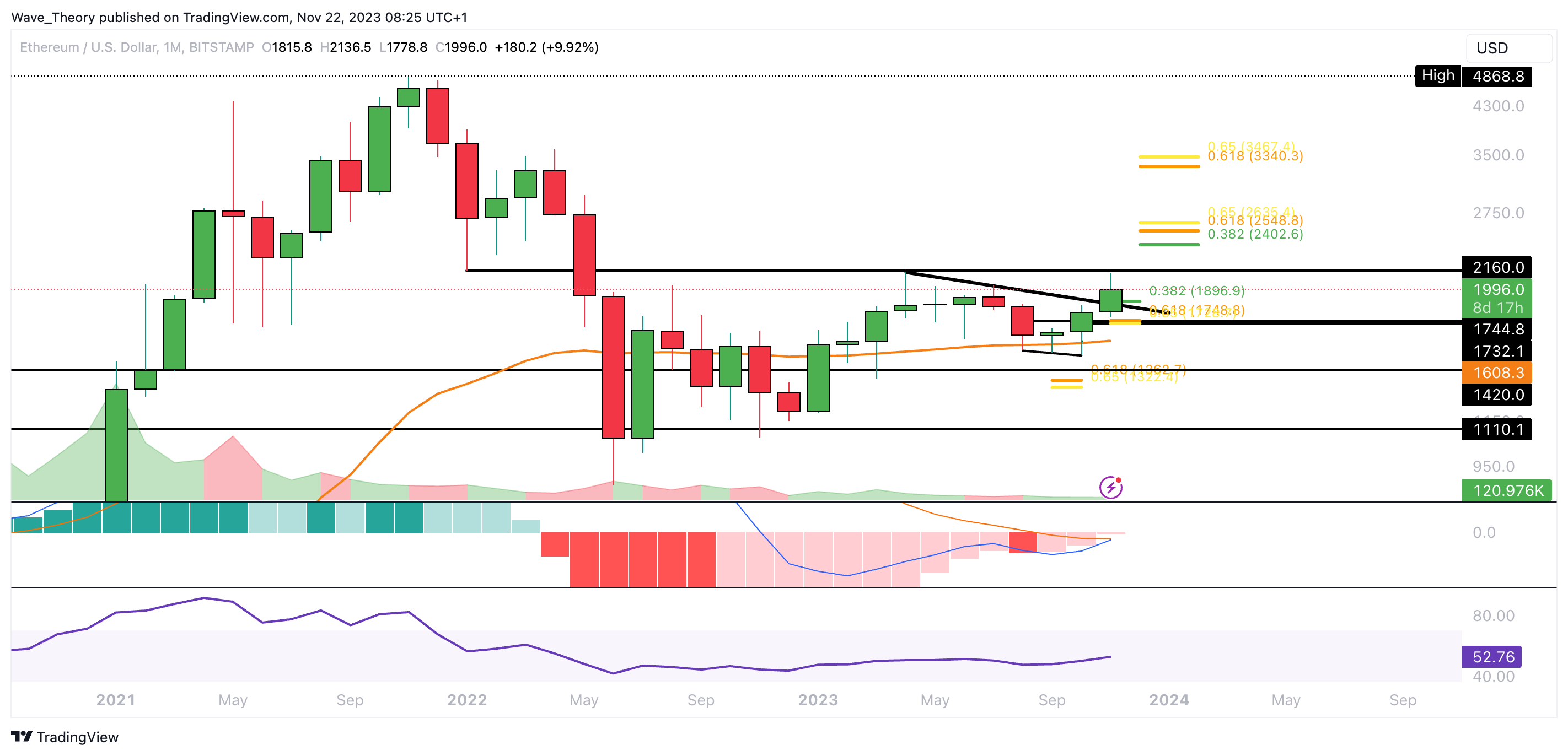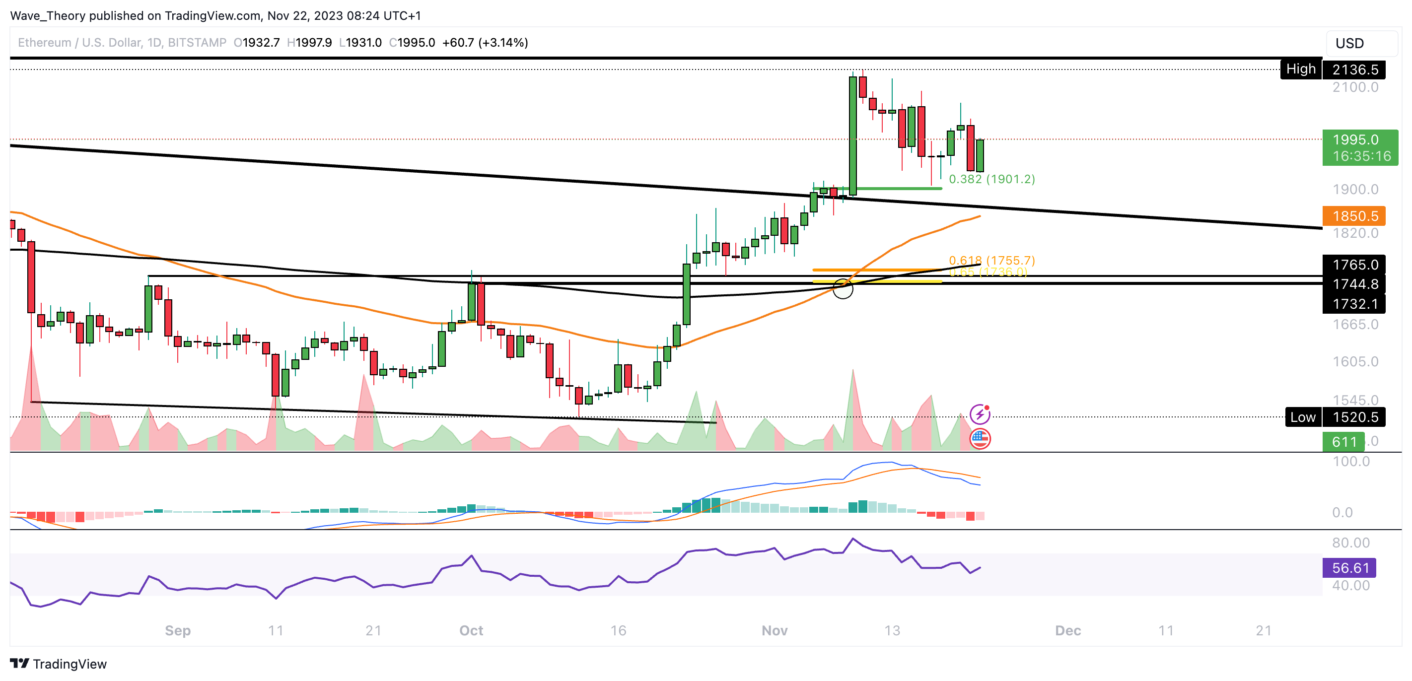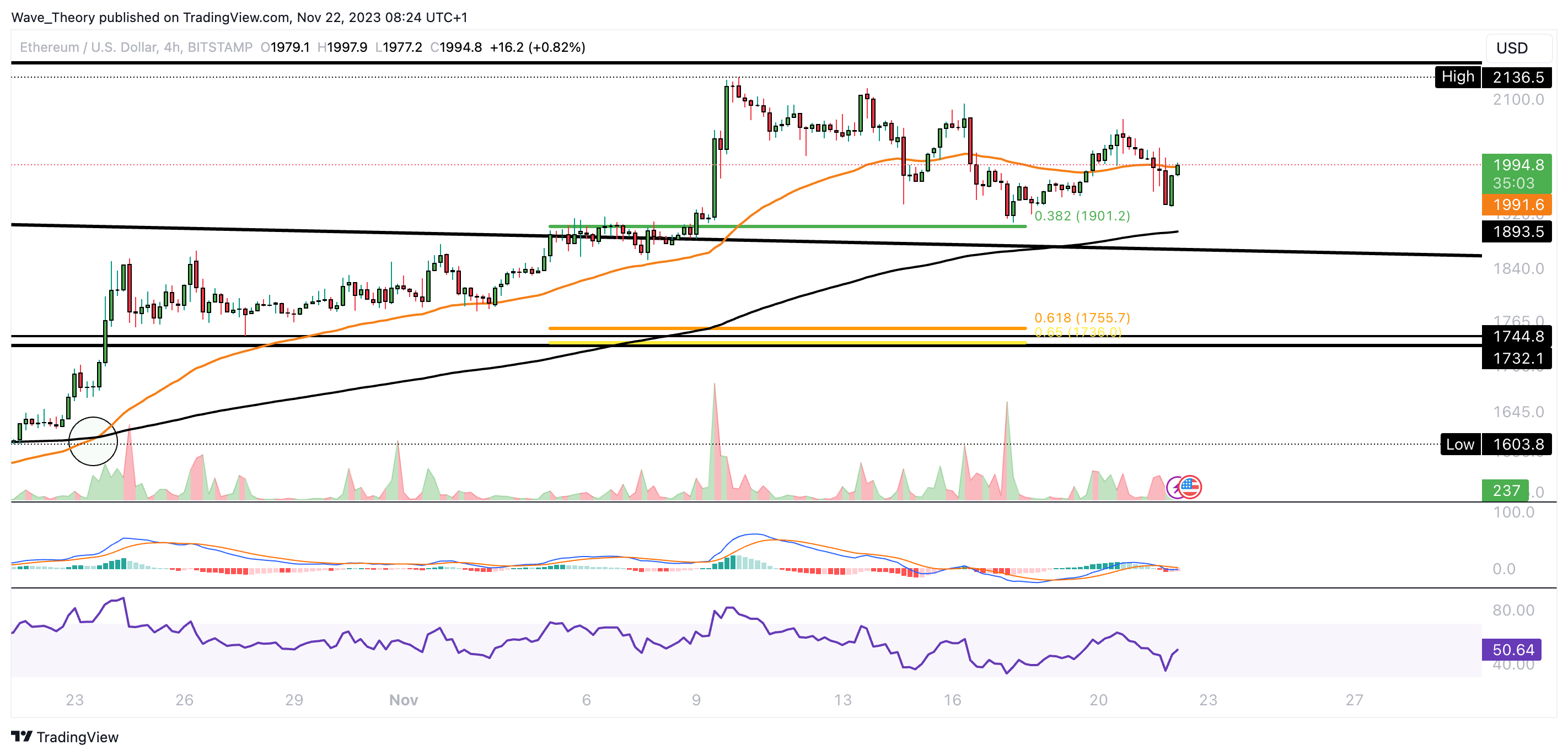 Der Ethereum Kurs ist zur 0,382 Fib Unterstützung bei rund 1.901 USD korrigiert