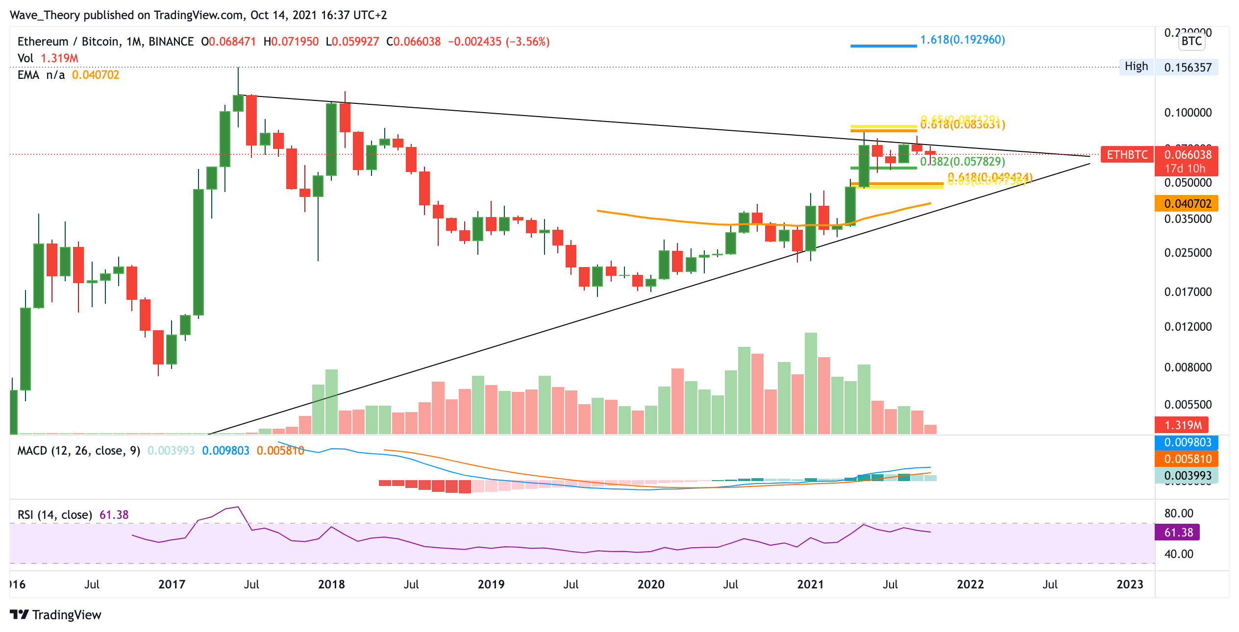 Gegen Bitcoin ist der Trend nicht eindeutig bullisch. Tatsächlich scheint Bitcoin aktuell leicht zu dominieren, denn der ETH Kurs wurde an der Golden Ratio bei 0,084 BTC abgewiesen. Seither pendelt der ETH Preis zwischen der Fibonacci Unterstützung bei 0,057 BTC und besagtem Widerstand. Darüber hinaus befindet sich der ETH Kurs in einem symmetrischen Dreieck. Je nachdem ob es bullisch oder bärisch ausbricht, wird sich der mittelfristige Trend von Ethereum fügen. Aktuell befindet sich der ETH Kurs aber näher an einem bullischen als an einem bärischen Ausbruch.