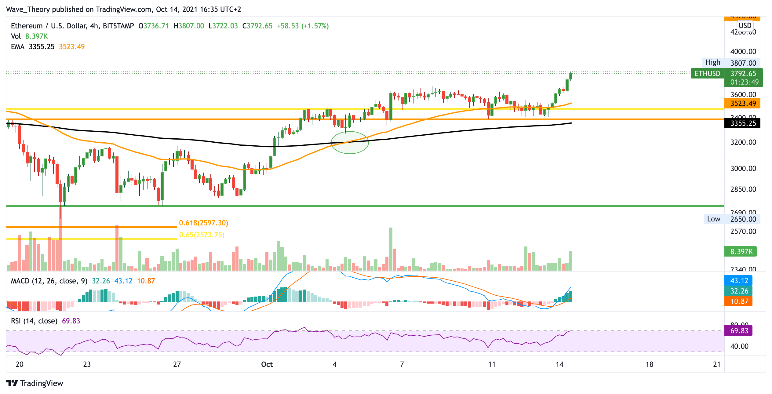 Auch im 4H Kurs etablierte sich ein Golden Crossover der EMAs. Zusätzlich entwickelt sich der MACD bullisch und der RSI gibt keine bärischen Signale.