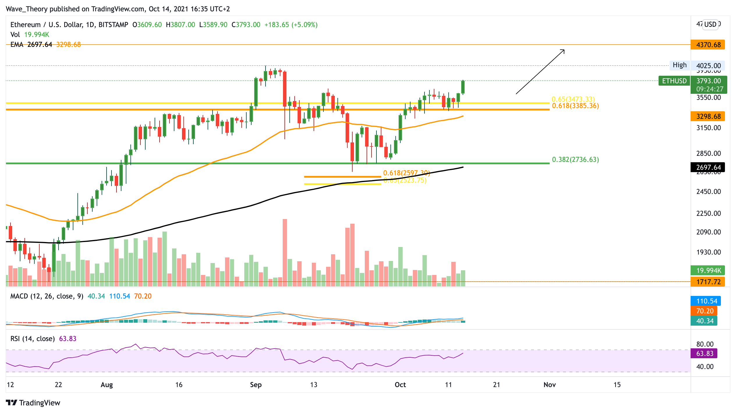 Dafür müsste der Ethereum Kurs aber erst einmal das Allzeithoch bei rund 4.400 USD brechen, welches nicht mehr weit entfernt ist. Sollte Ethereum daran abgewiesen werden, findet er bereits an der Golden Ratio bei 3.300 USD Unterstützung. Dort eilt zusätzlich der 50-Tage-EMA zur Hilfe. Insgesamt ist der Trend von Ethereum aber bullisch. Auch das Golden Crossover der EMAs bleibt bestehen. Es sieht gut aus für Ethereum.