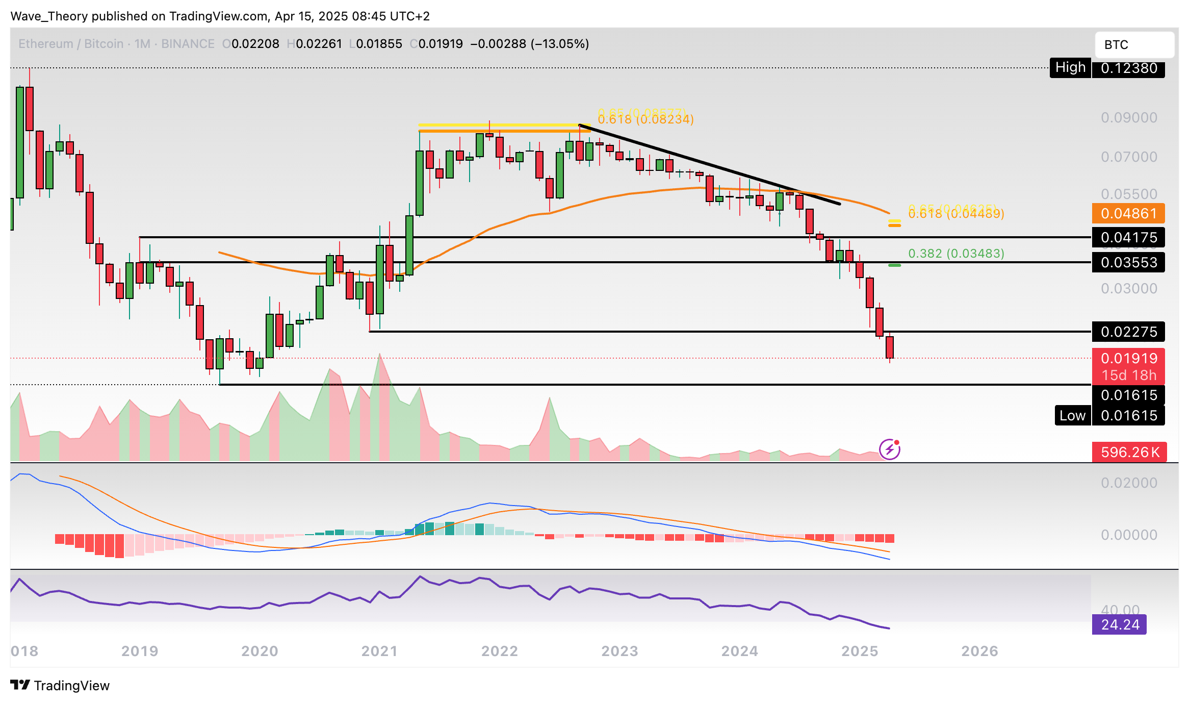 Gegen BTC dringt Ethereum tiefer in die Unterstützungszone zwischen rund 0,01615 BTC und 0,02275 BTC ein. Dort könnte der Kurs bullisch abprallen, um eine Aufwärtsbewegung zu initiieren.