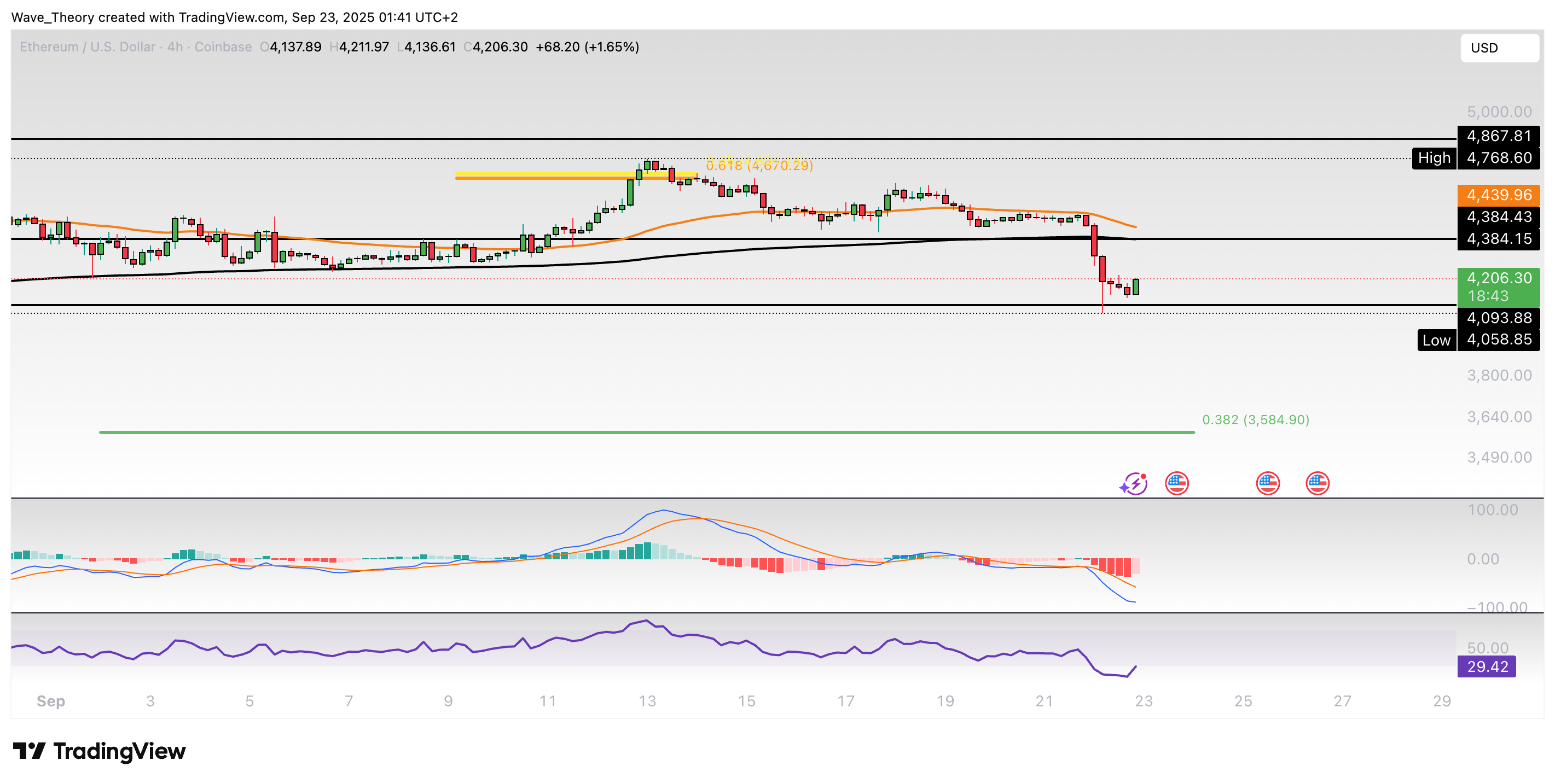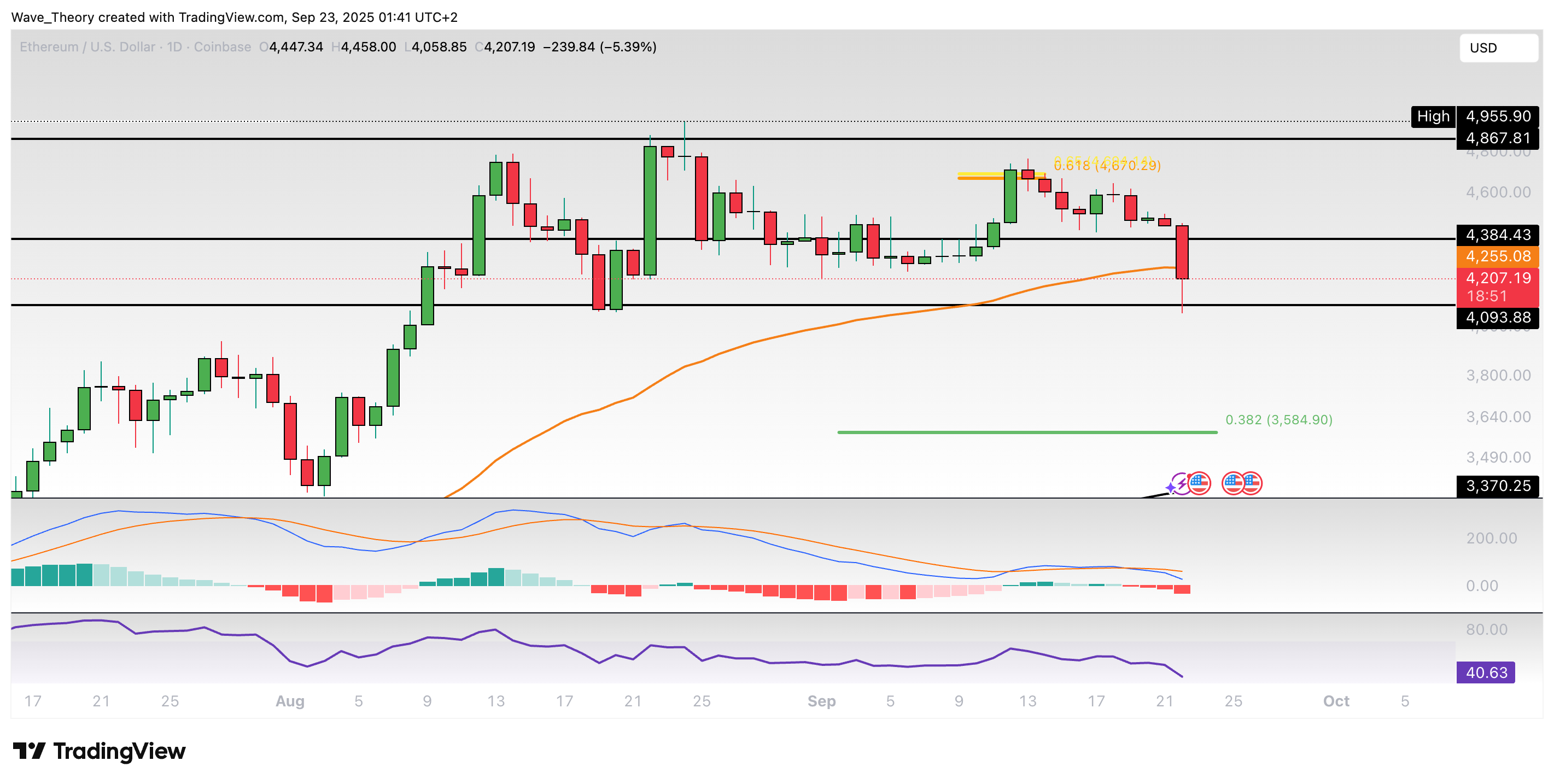 Ethereum-Prognose für Dienstag, 23. September 2025: Der Ethereum Kurs fällt jetzt stark, nachdem er am Golden Ratio Widerstand bärisch abgewiesen wurde.