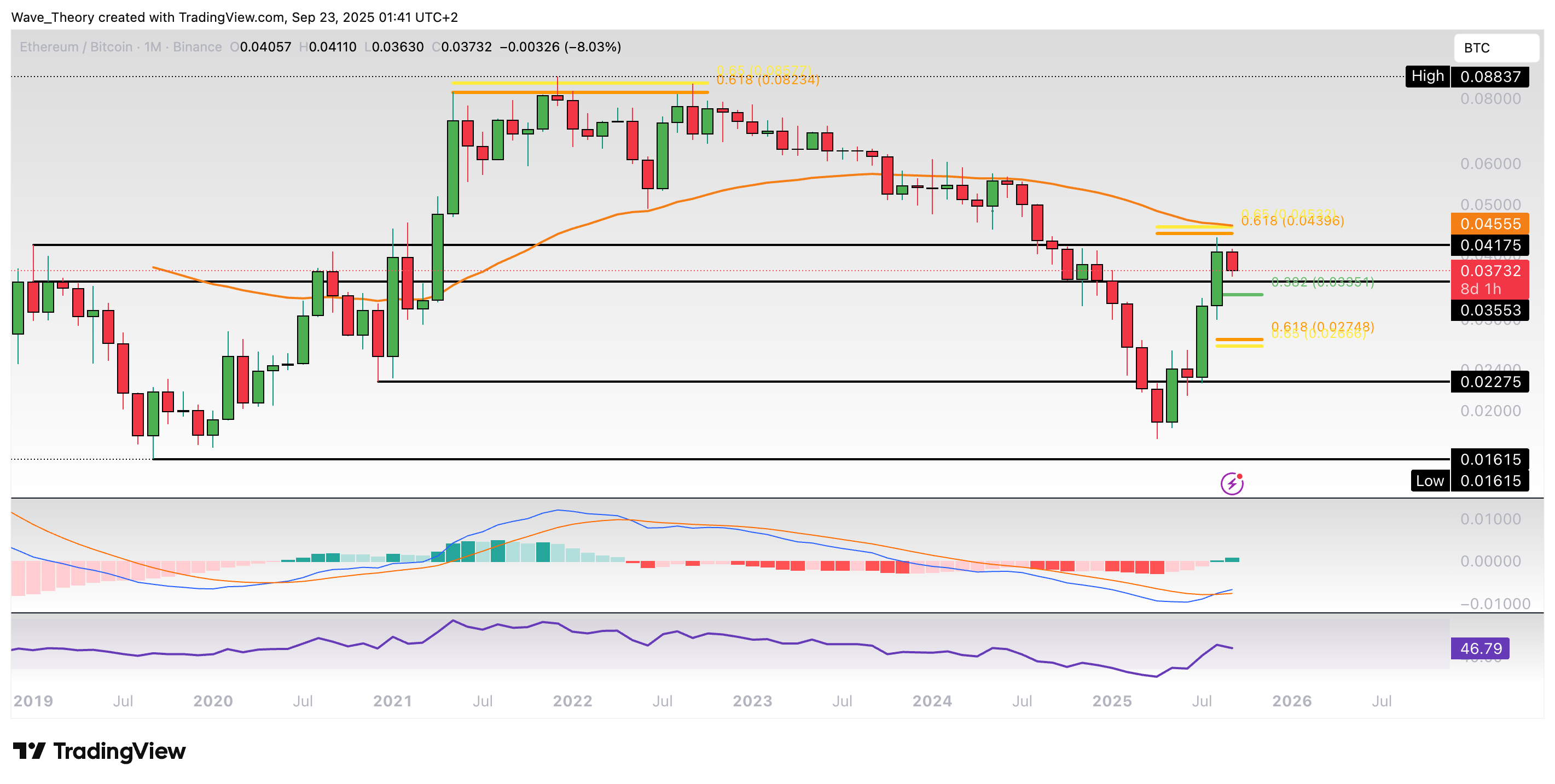Nach unten hin warten spätestens bei rund 0,033 BTC und 0,027 BTC die nächsten signifikanten Fibonacci Unterstützungen. Die Indikatoren zeigen sich dabei aber noch bullisch im Monatschart.
