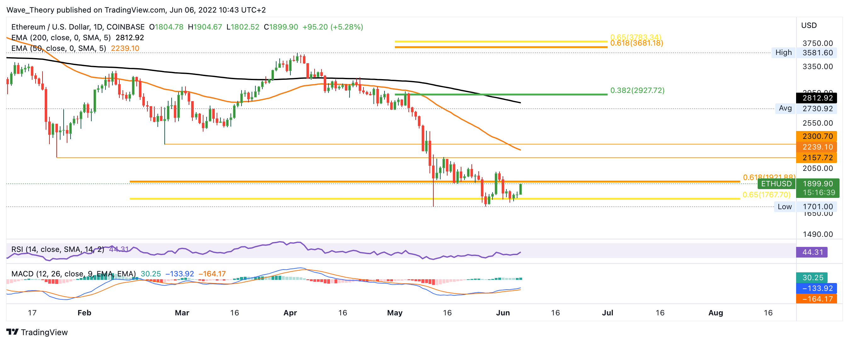 Insgesamt ist es also aktuell sehr bullisch zu betrachten, dass sich Ethereum erfolgreich über der Golden Ratio Unterstützung zwischen 1.700 – 1.900 USD halten konnte.