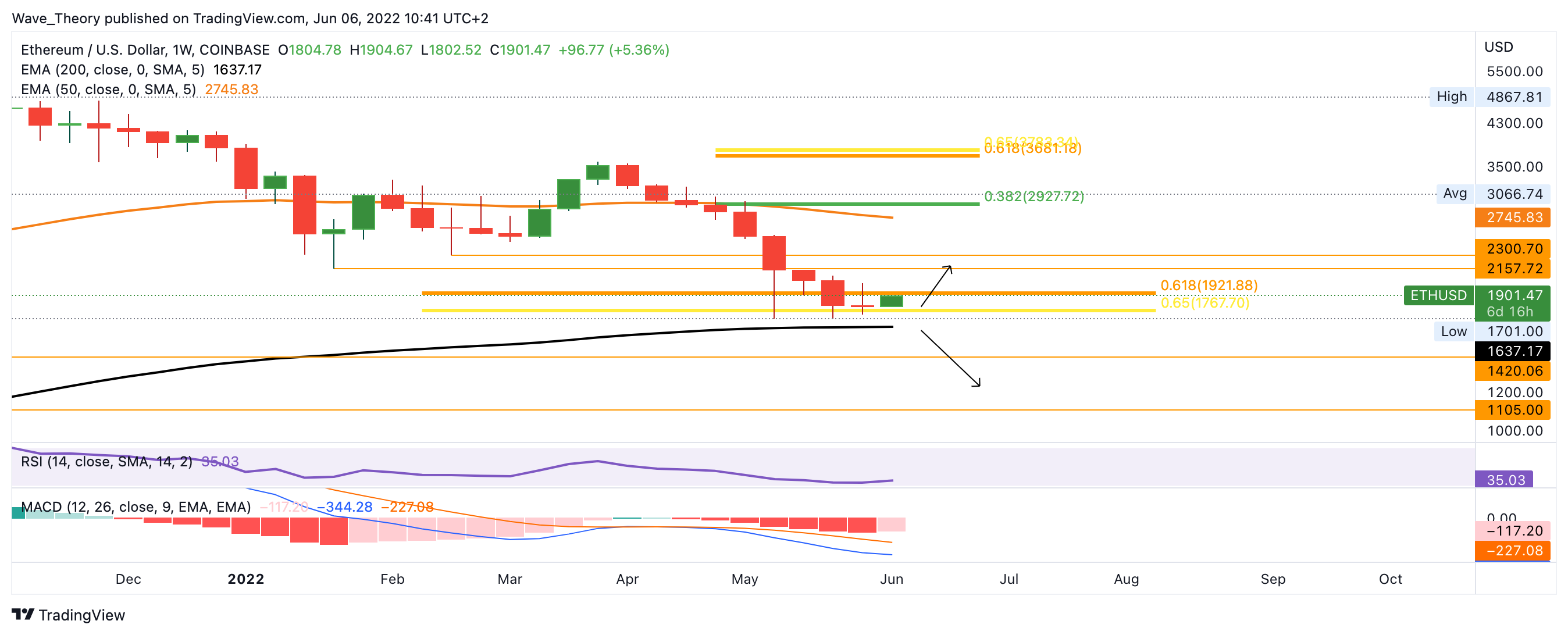 Sollte sich Ethereum über der Golden Ratio Unterstützung zwischen 1.700 – 1.900 USD halten kann, sieht es kurz-bis mittelfristig sehr bullisch für Ethereum aus. Ethereum sollte aber nicht tiefer als rund 1.600 USD fallen, denn dort stößt Ethereum auf den 50-Monate-EMA, welcher als letzte Instanz fungiert, den Ethereum Kurs vor einem Rückgang auf 1.105 – 1.420 USD zu bewahren.