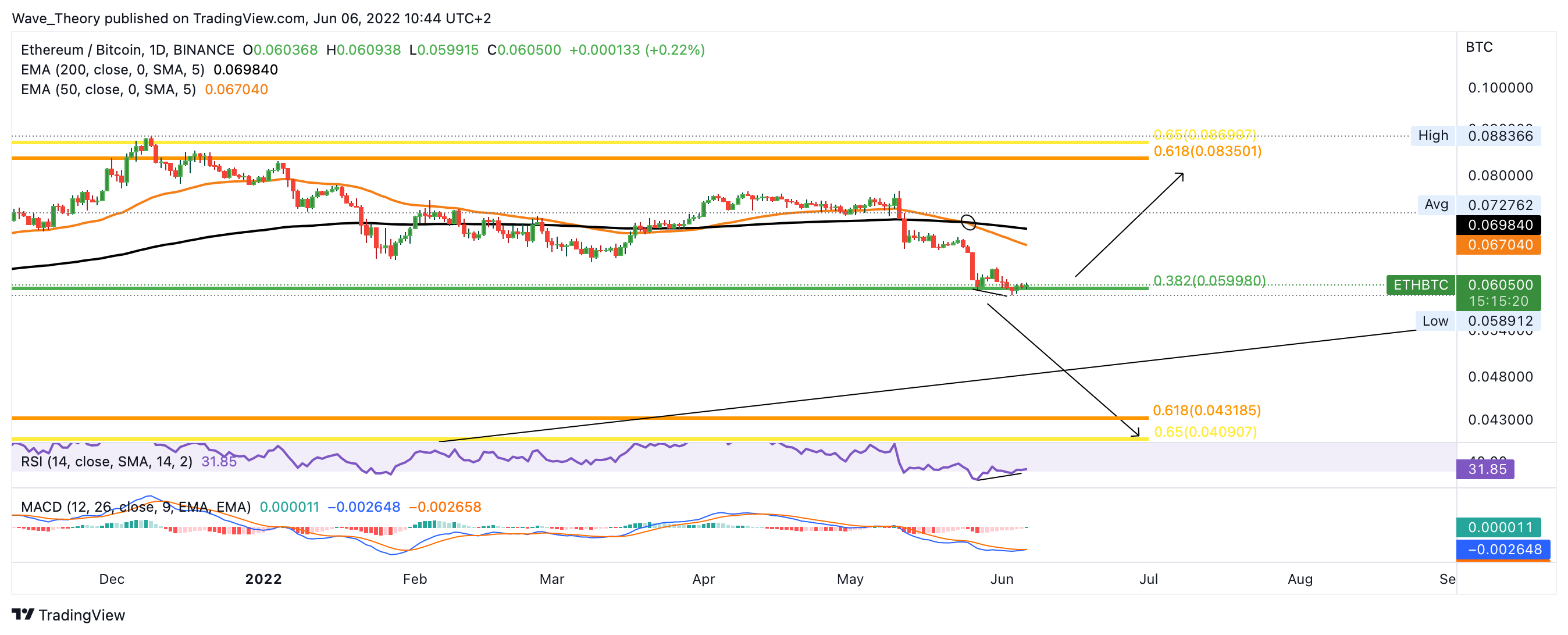 Dennoch bleibt das bärische Death Cross der EMAs weiterhin intakt, womit der Trend kurz-bis mittelfristig bärisch bestätigt bleibt. Sollte Ethereum die Unterstützung bei rund 0,06 BTC bärisch brechen, so findet Ethereum bei rund 0,042 BTC die nächste, signifikante Fibonacci Unterstützung.