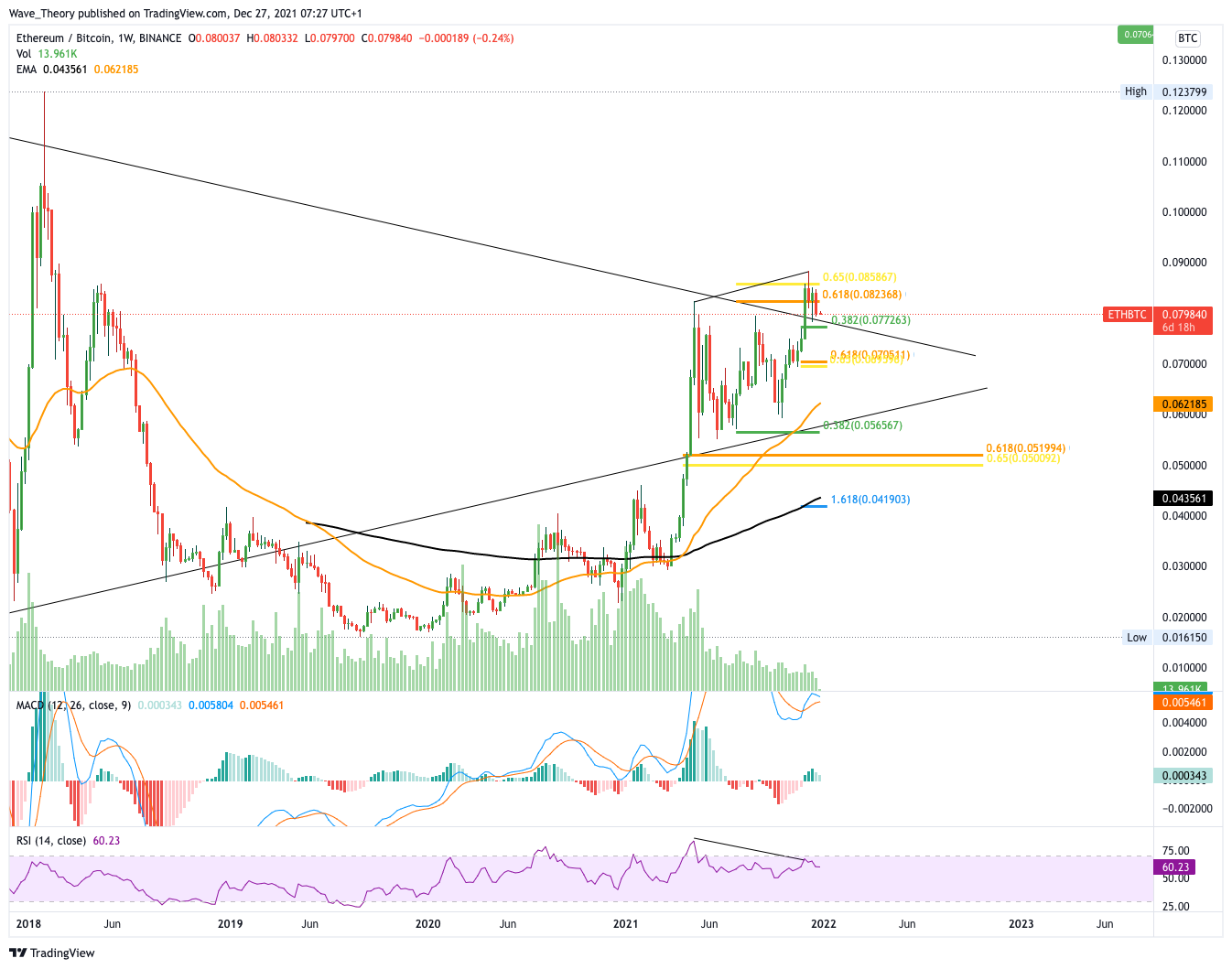 Gegen BTC wurde der ETH Kurs nun an dem Golden Ratio Widerstand bei rund 0,085 BTC abgewiesen. Zusätzlich formte sich nun eine massive bärische Divergenz im RSI und MACD des Wochencharts. Ethereum findet bei 0,075BTC, 0,056 BTC, rund 0,05 BTC und 0,042 BTC die nächsten signifikanten Unterstützungen.