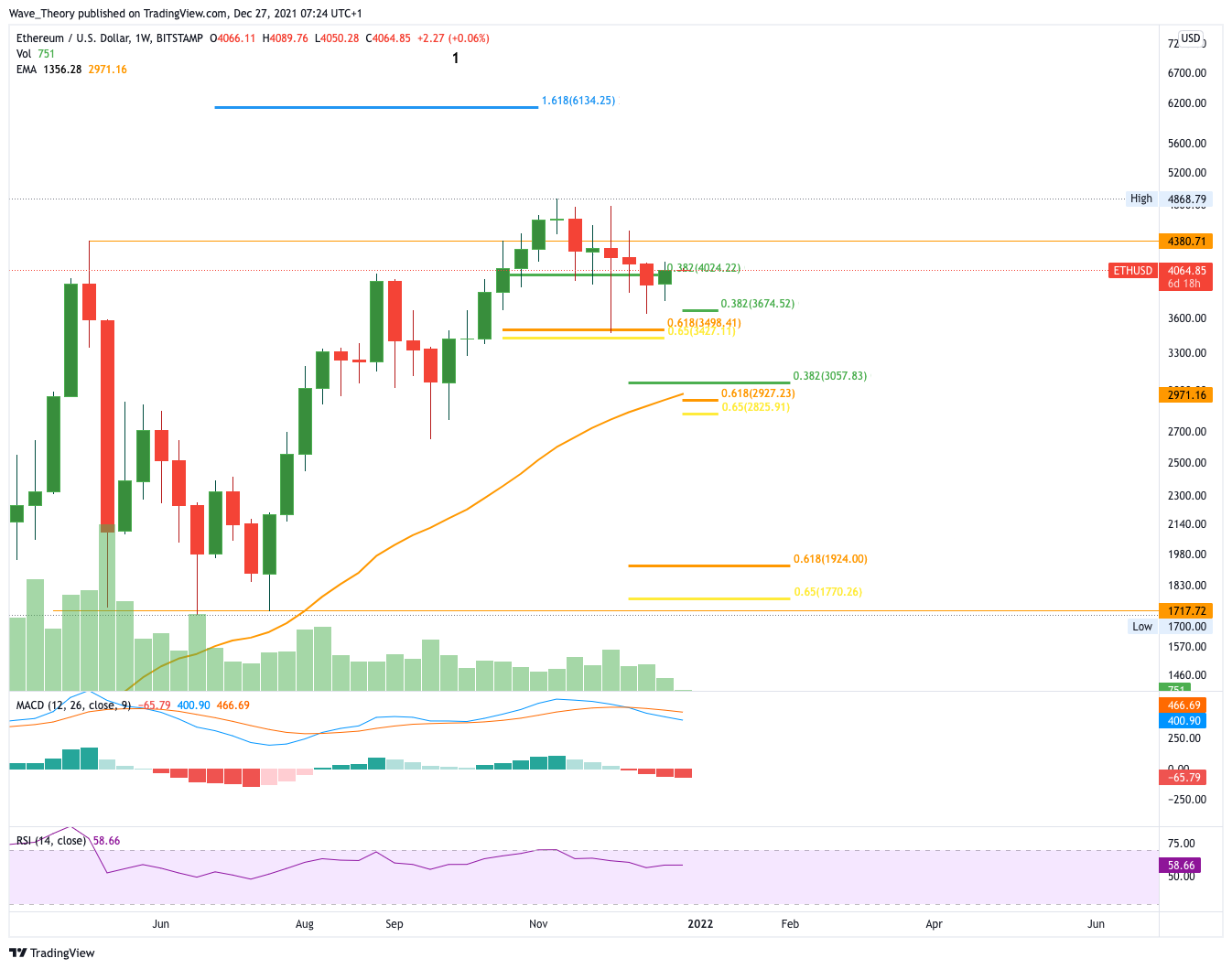 Bei 3.000 USD wartet massive Unterstützung auf den ETH Kurs. Dort liegen zwei wichtige Fibonacci Niveaus, der 50-Wochen-EMA und eine horizontale Unterstützung bedingt durch ein lokales Tief.