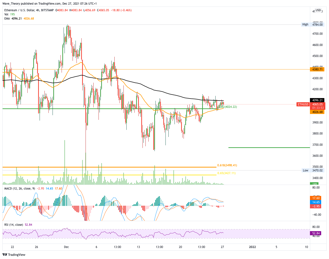 Im 4H Kurs ist es nicht der 50-EMA, sondern der 200-4H-EMA, an dem Ethereum scheitert. Sollte Ethereum diesen Widerstand jedoch brechen, könnte daraufhin ein Golden Crossover folgen womit der Trend bullisch bestätigt wäre. Immerhin sind die EMAs nicht mehr weit voneinander entfernt. Sollte Ethereum die 4.100 USD Hürde überwinden können, so findet er bei rund 4.400 USD den nächsten, signifikanten Widerstand.