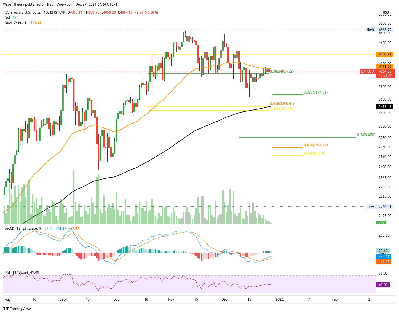 Der Ethereum Kurs konnte zwar den 0,382 Fib Widerstand bei rund 4.000 USD überwinden, nachdem er an der Golden Ratio bei rund 3.500 USD stark abprallte, jedoch gelingt es Ethereum aktuell nicht, den 50-Tage-EMA bei rund 4.100 USD zu überwinden. Ethereum sollte diesen Widerstand unbedingt überwinden, um die Korrektur zu beenden und seinen Aufwärtstrend erneut aufzunehmen.