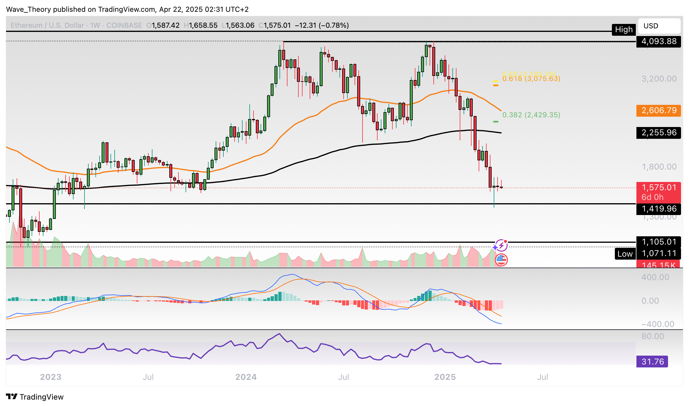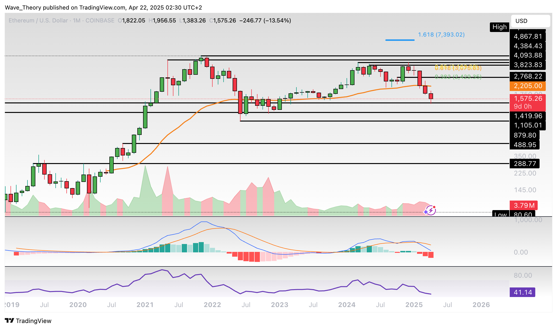 Sollte Ethereum an der Unterstützung bei rund 1.105 USD und 1.420 USD bullisch abprallen, wartet am 50-Monate-EMA bei rund 2.205 USD der nächste signifikante Widerstand.