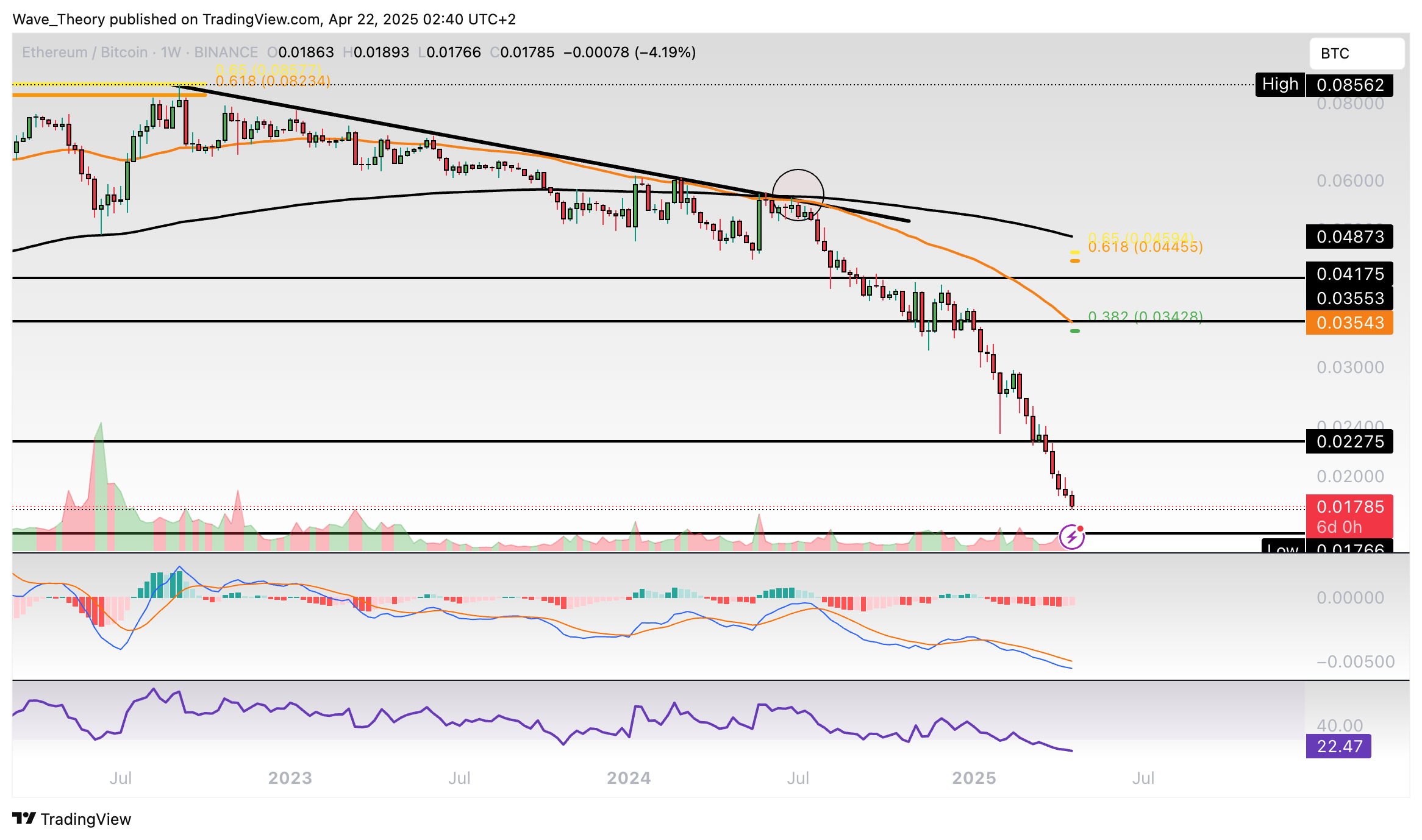 Dann warten bei rund 0,0343 BTC und bei rund 0,045 BTC die nächsten signifikanten Fibonacci Widerstände. Dort fungieren die 50-Wochen- und 200-Wochen-EMA als zusätzliche Widerstände.