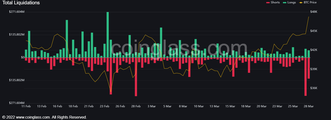 In den letzten 24 Stunden wurden im gesamten Kryptomarkt 80.000 Trades mit einem Gesamtwert von 456 Millionen US-Dollar liquidiert. Ethereum schafft es mit 140 Millionen US-Dollar hinter Bitcoin auf Platz 2 mit 172 Millionen US-Dollar. An den roten Spitzen sieht man, dass die Shorts überwiegen. Trader spekulierten also auf einen fallenden Markt und wurden vermutlich überrascht.