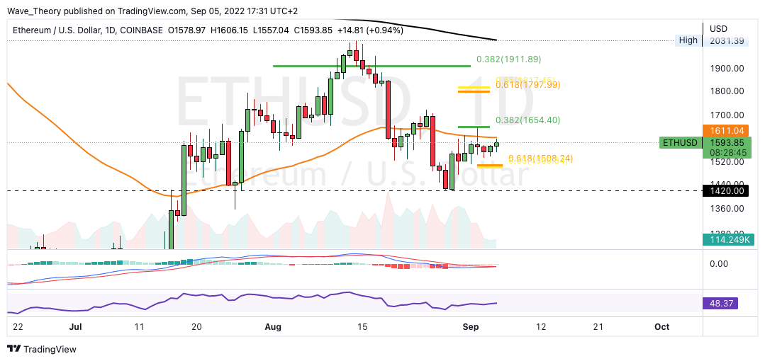 Der Ethereum Kurs unternahm vor wenigen Tagen erneut den Versuch, den 50-Tage-EMA Widerstand bei rund 1.611 USD zu brechen. Ethereum wurde dabei aber am 0,382 Fib Niveau bei rund 1.655 USD bärisch abgewiesen und schloss dabei sogar unter dem 50-Tage-EMA. Nun unternimmt Ethereum den dritten Versuch, den 50-Tage-EMA bei rund 1.611 USD zu brechen.