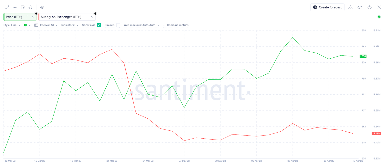 Laut den On-Chain Daten von Santiment befinden sich aktuell nur rund 10 % der zirkulierenden Ethereum auf Börsen. Demnach befindet sich der Großteil der Ethereum Coins auf Wallets, auf denen der Handel nicht so schnell funktionieren wird. Das zeigt, dass viele Ethereum Holder derzeit wohl nicht gewillt sind, Ethereum zu verkaufen.