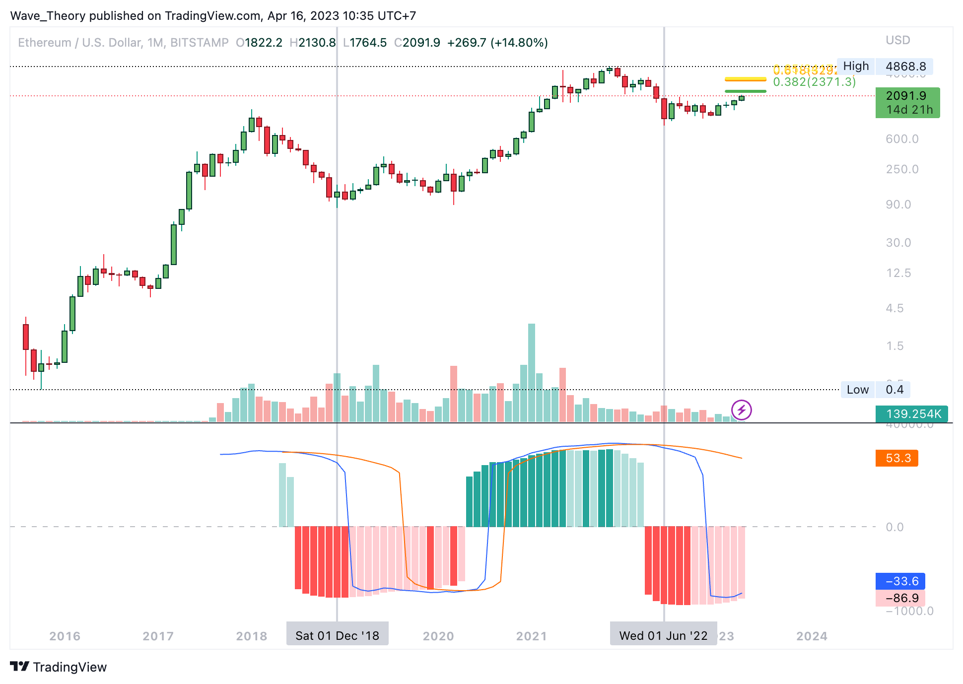 Für Ethereum gilt diese Beobachtung nicht, jedoch bedeutet das Ende des Bärenmarktes von Bitcoin auch der Beginn eines neuen Bullentrends für Ethereum. Ethereum findet jetzt bei rund 2.371 USD und bei rund 3.400 USD die nächsten signifikanten Fib Widerstände. Wenn Ethereum die Golden Ratio bei rund 3.400 USD bricht, befindet sich Ethereum offiziell in einem neuen Bullentrend.