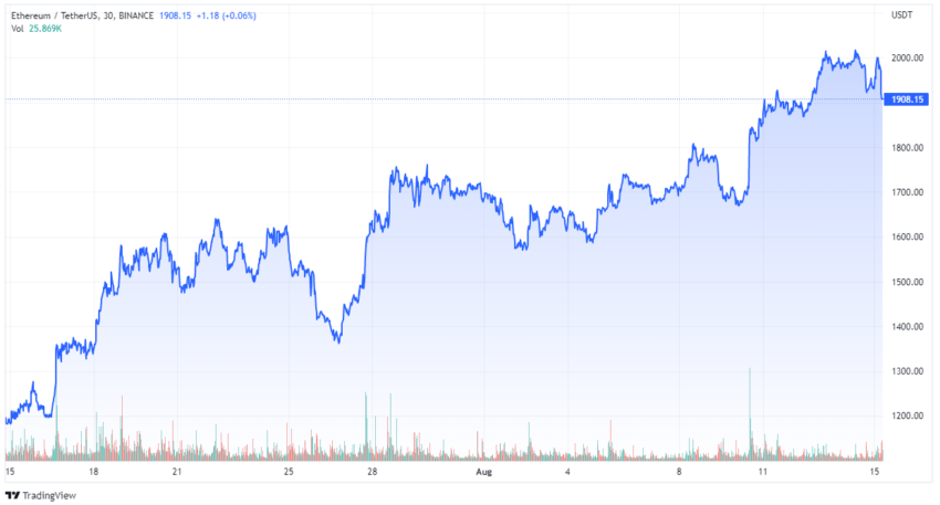 Der ETH-Kurs hingegen entwickelte sich in der Zwischenzeit sehr gut und ist in der letzten Woche um fast 14 % gestiegen. Dies ist auf die positiven Nachrichten bezüglich des Merge zurückzuführen. Zum Zeitpunkt der Veröffentlichung dieses Artikels liegt der ETH-Kurs bei 1.910 US-Dollar.