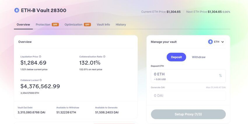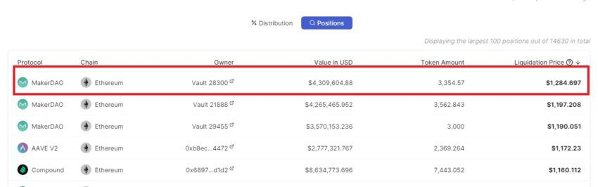 Aufgrund der fallenden Preise auf dem Kryptomarkt, drohen einigen DeFi-Protokollen bald Liquidierungen. Laut DeFi Llama könnte ein besonderer MakerDAO-Vault mit Sicherheiten im Wert von etwa 4,3 Millionen US-Dollar bereits bei einem ETH-Preis von 1.284 US-Dollar liquidiert werden.