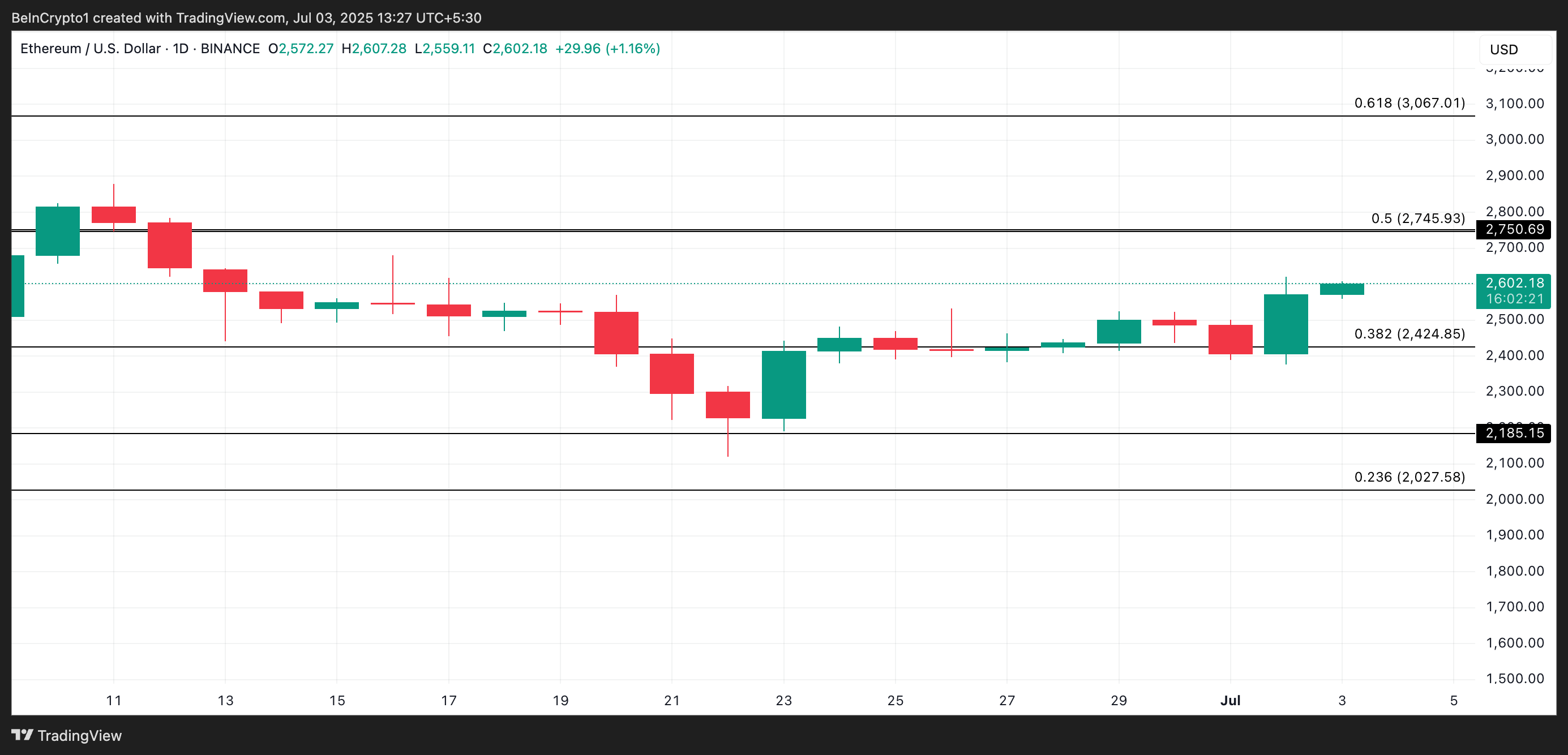 Zum Zeitpunkt der Veröffentlichung handelt ETH bei 2.602 USD. Ein Wiederaufleben der Nachfrage könnte dazu führen, dass der Altcoin über den wichtigen Widerstandsbereich bei 2.750 USD ausbricht und möglicherweise den Weg für eine Rallye in Richtung 3.067 USD ebnet.