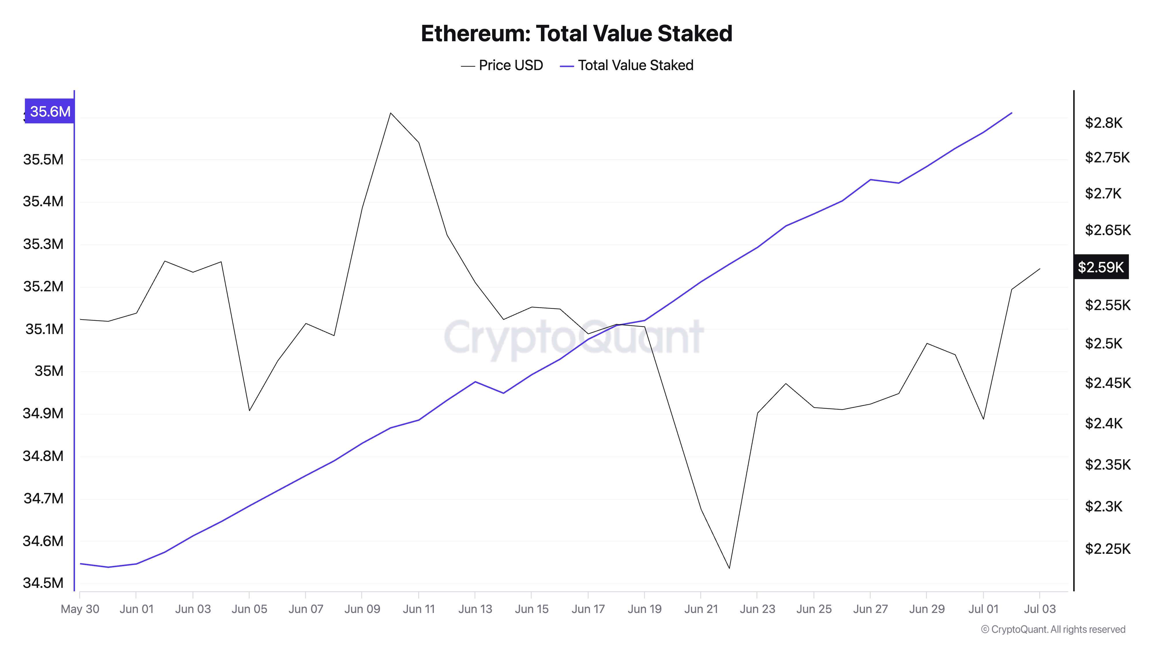 Laut dem Bericht bewegen Wale wöchentlich rund 60.000 ETH in Staking-Verträge, was langfristiges Vertrauen in das Netzwerk und seinen Coin zeigt. Laut den Daten von CryptoQuant hat der Gesamtwert der gestakten ETH 36 Millionen Coins erreicht und ist im Juni um 3 Prozent gestiegen.