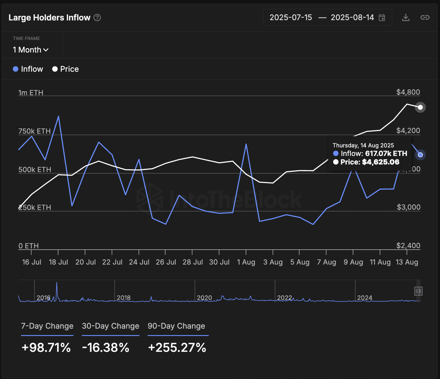 Selbst nach kurzen Rückschlägen haben diese Zuflüsse weiterhin höhere Hochs im Monatschart erreicht. Die Zahl erreichte am 13. August 725.000 ETH, bevor sie sich bei über 617.000 ETH stabilisierte. Dies ist ein Zeichen dafür, dass Käufer mit tiefen Taschen weiterhin Positionen aufbauen.
