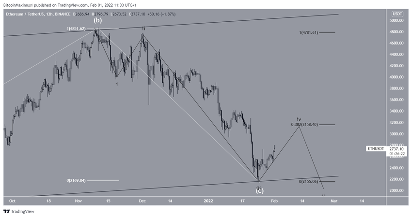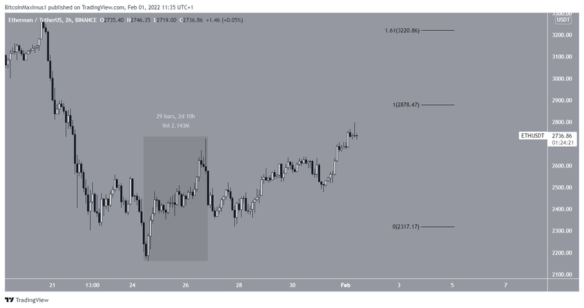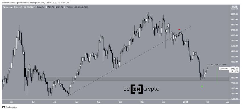 Der Ethereum Kurs ist, seitdem er das letzte Allzeithoch bei 4.868 USD erreichte, in einem Abwärtstrend gewesen. Nachdem der ETH Kurs unter die unten gezeigte Support-Linie ausgebrochen ist und diese dann als Widerstand validiert hatte, folgte eine starke und schnelle Abwärtsbewegung. Am 24. Januar 2022 erreichte der ETH Kurs dann den letzten Tiefpunkt bei 2.159 USD. Danach prallte der ETH Kurs von diesem Tiefpunkt ab und gewann dann horizontalen Bereich bei 2.350 USD als Unterstützung zurück. Seitdem konnte der Ethereum Preis um 27% ansteigen.