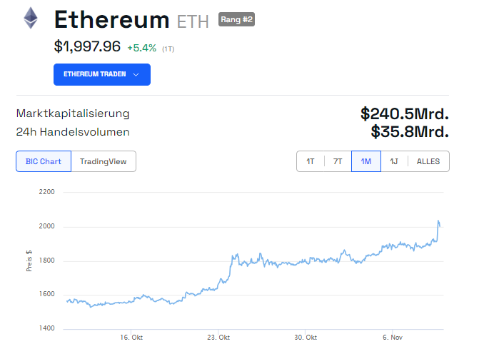 Die Euphorie rund um diese News befeuerten die aktuelle Ethereum Aufwärtsbewegung. Sie verhalfen dem Kurs dazu, über die 2.000 US-Dollar Marke zu schellen. Damit befindet sich der ETH Preis auf einem neuem 3-Monatshoch und nur ca. 50 Prozent unter dem letzten Allzeithoch.
