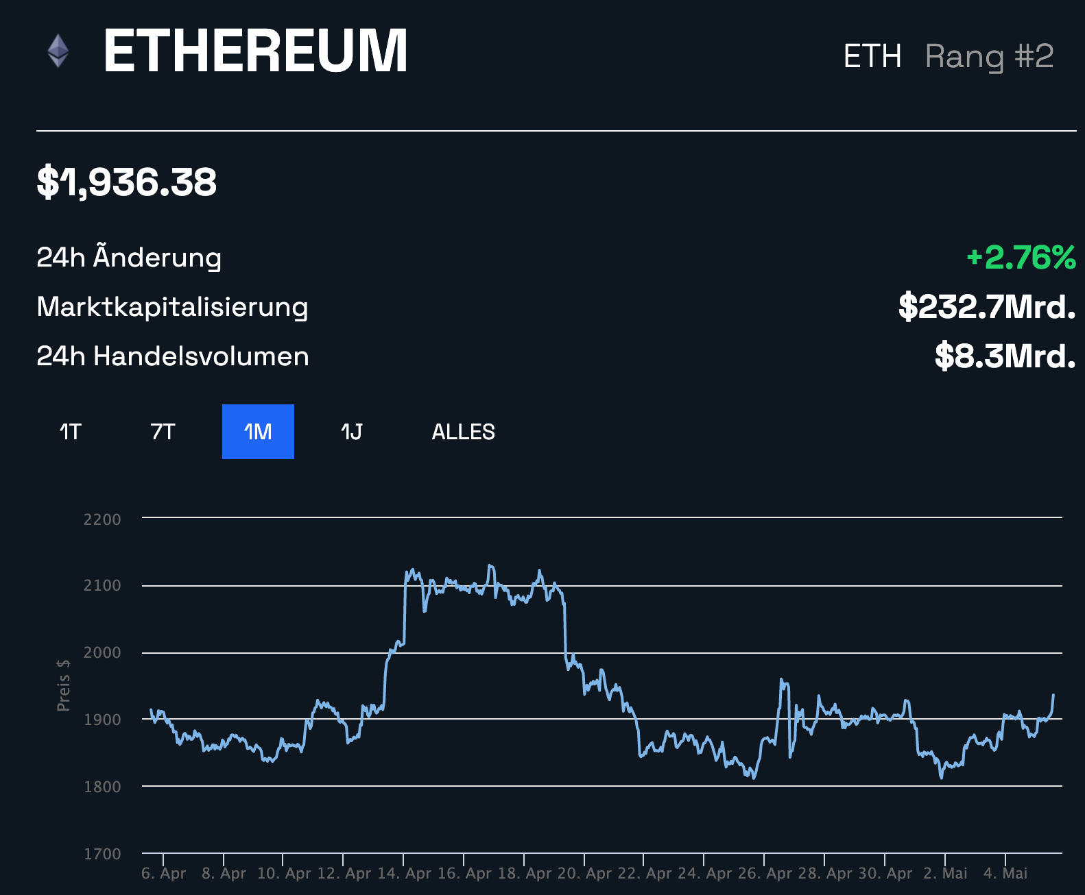 Seit dem Erreichen des Allzeithochs von über 4.800 US-Dollar im November 2021 ist Ethereum deutlich gefallen. Aktuell hält sich der digitale Vermögenswert bei etwa 1.860 USD.