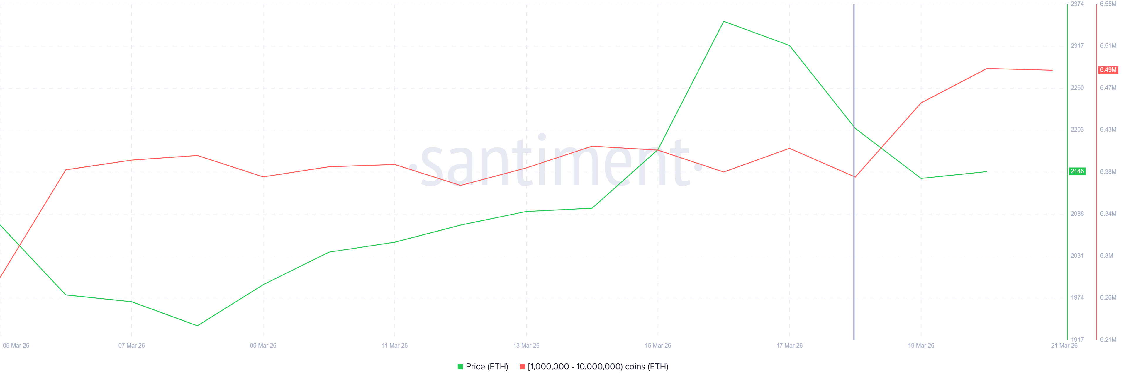Daten von Santiment vom 18. bis 21. März zeigen, dass Wallets mit einem Bestand zwischen 1 Million und 10 Millionen ETH von etwa 6,38 Millionen auf 6,49 Millionen Coins gestiegen sind. Das ist ein Plus von 110.000 ETH. Diese Menge hat derzeit einen Wert von 235 Millionen USD und zeigt Zuversicht.