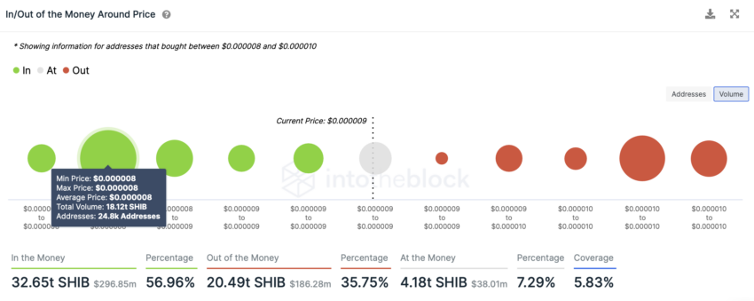 Kleininvestoren waren dabei die Gruppe, welche die aktuelle Kursentwicklung am meisten beeinflussten. Ein Blick auf den In/Out of Money Indikator der Krypto-Firma IntoTheBlock zeigt, dass bei der 0,0000080-US-Dollar-Preismarke 24.800 verschiedene SHIB-Adressen insgesamt 18,12 Billionen SHIB Coins gekauft haben. Bei diesem Preislevel befindet sich also eine solide Unterstützung für den Shiba Inu Kurs.