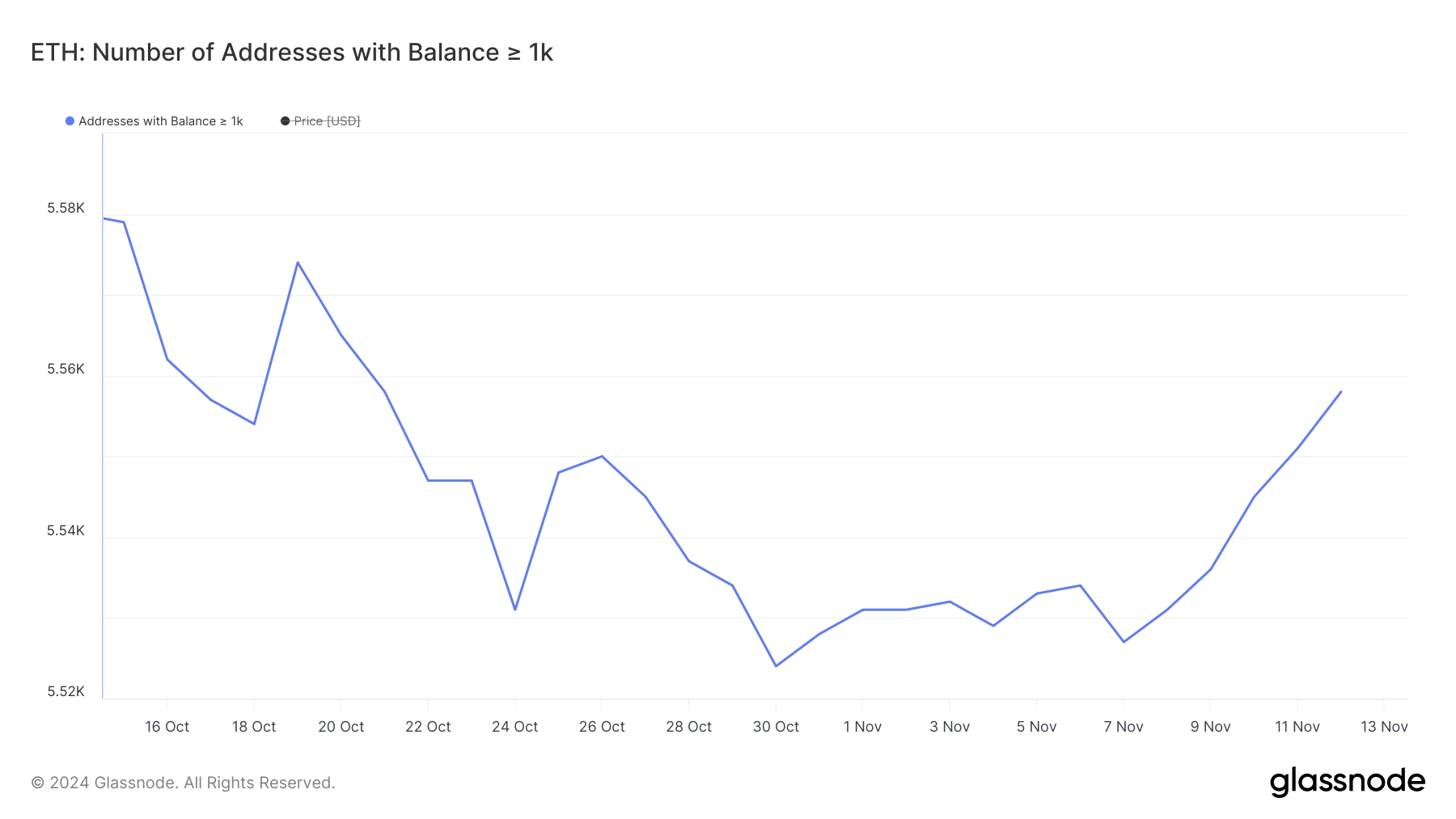 Nach Wochen des Rückgangs hat die Zahl der Wale mit mindestens 1.000 Ethereum endlich wieder zugenommen. Diese Trendwende setzte am 7. November ein, und seitdem ist die Zahl kontinuierlich von 5.527 am 7. November auf 5.558 am 12. November gestiegen.