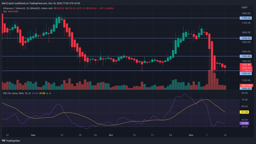 Am 9. November 2022 erreichte der ETH Kurs bei 1.073 US-Dollar den letzten Tiefpunkt und zog dann weiter an. Der Preisbereich zwischen 1.000 und 1.200 US-Dollar fungierte also als solide Unterstützungszone. Zum Zeitpunkt der Veröffentlichung des Artikels wird der ETH Kurs mit einem Tagesplus von 1 % bei 1.254 US-Dollar gehandelt. Allerdings fiel der ETH Preis im Vergleich zur Vorwoche um 20,58 %.