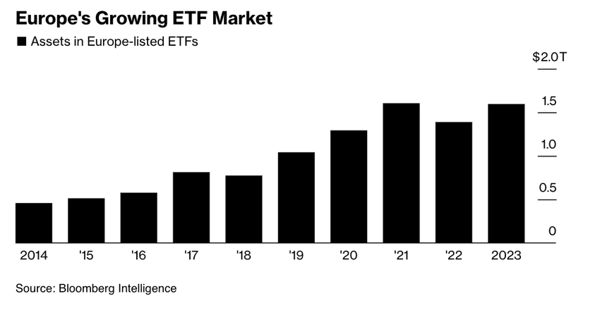 Wie der unten nachstehende Screenshot von Bloomberg Intelligence zeigt, ist der europäische ETF-Markt aktuell über 1,5 Billionen US-Dollar wert.